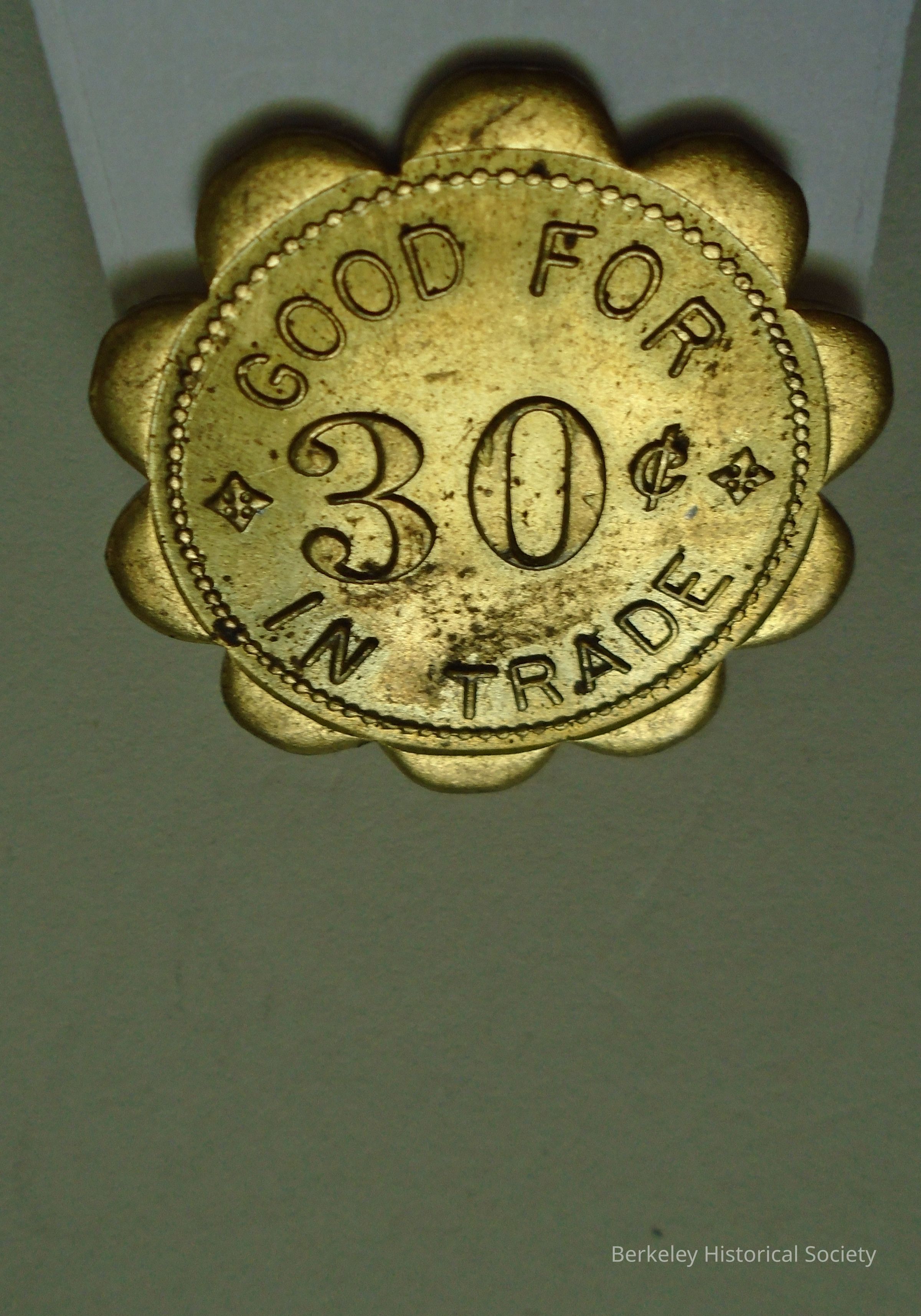 Brass token, one side reads: "GOOD FOR 30 CENTS IN TRADE". The other reads: Collectors' Items Shop, F.W.B., 1317 Gilman, Berkeley, CAL. Token is round with scalloped edge.Made/Created
