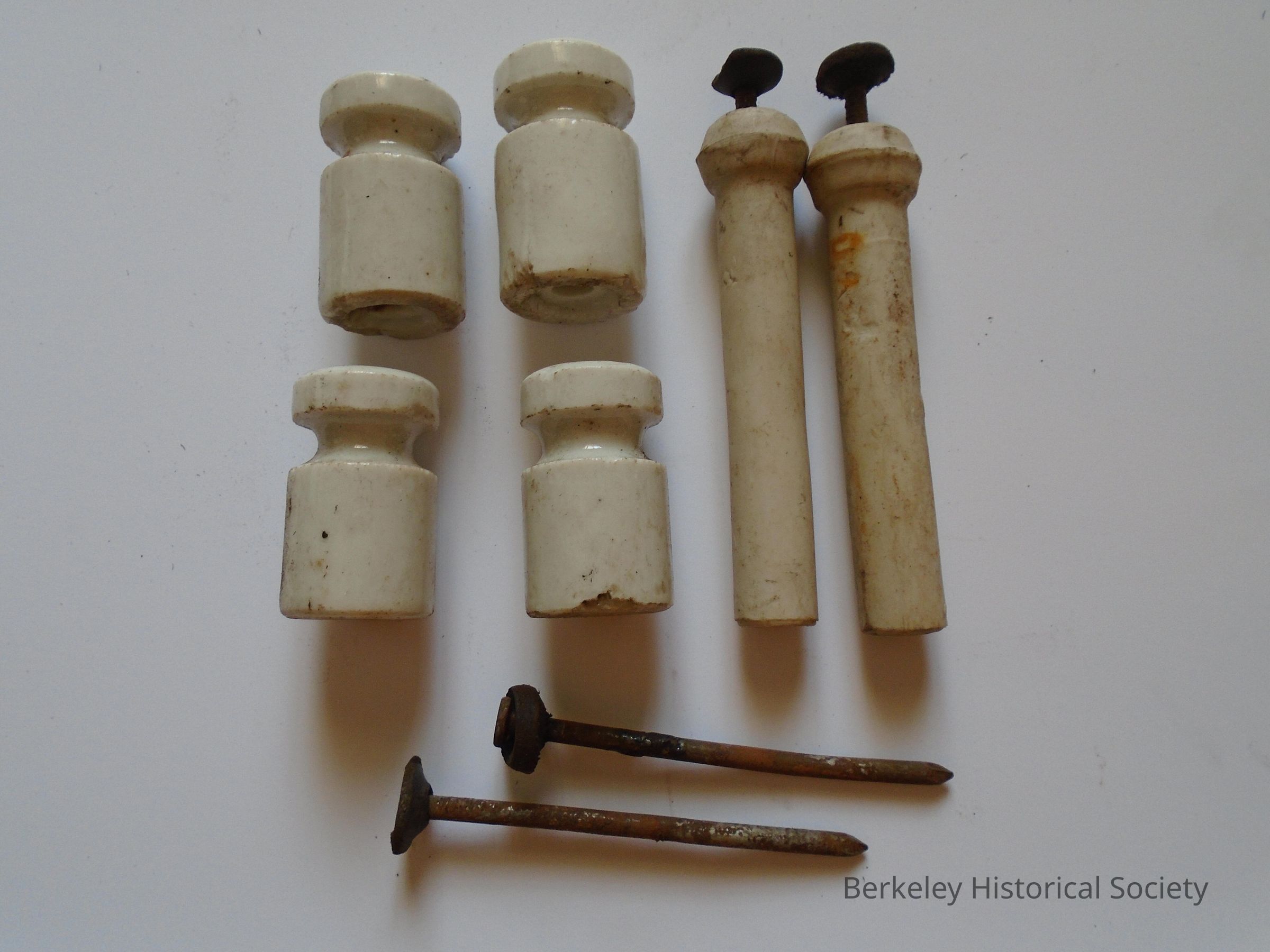Porcelain electrical wire insulators: 4 knobs, 2 tubes and nails. From a house at 2328 Carlton St., Berkeley. 4" and 2"