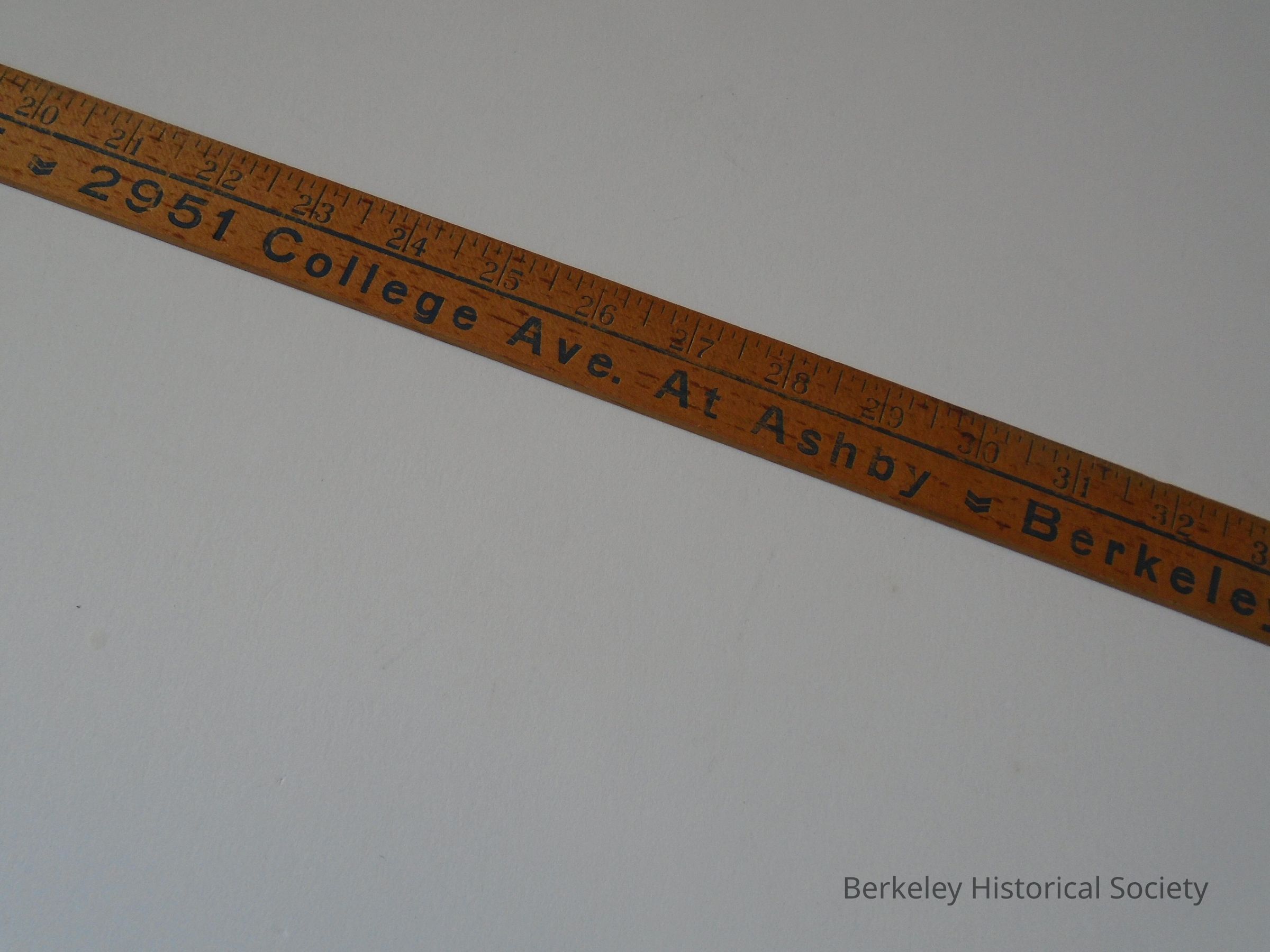 Wood yardstick, 36" with "BOLFING'S ELMWOOD HARDWARE, 2951 College Ave. at Ashby Berkeley. Dial 843-3794" printed on both sides.
