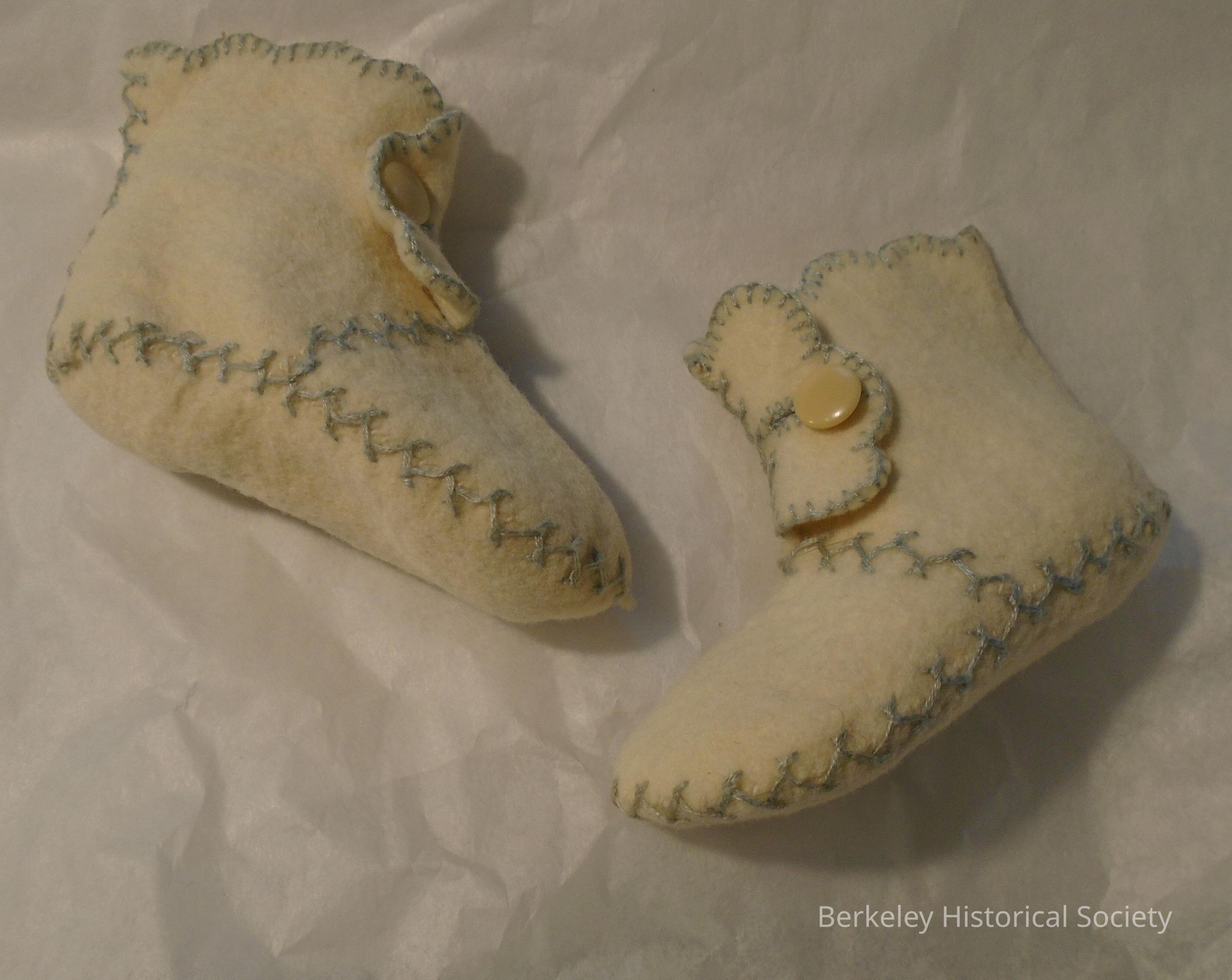 White, wool felt, handmade baby bootees with blue embroidery trim and button closing. See family info on 1978.002.265