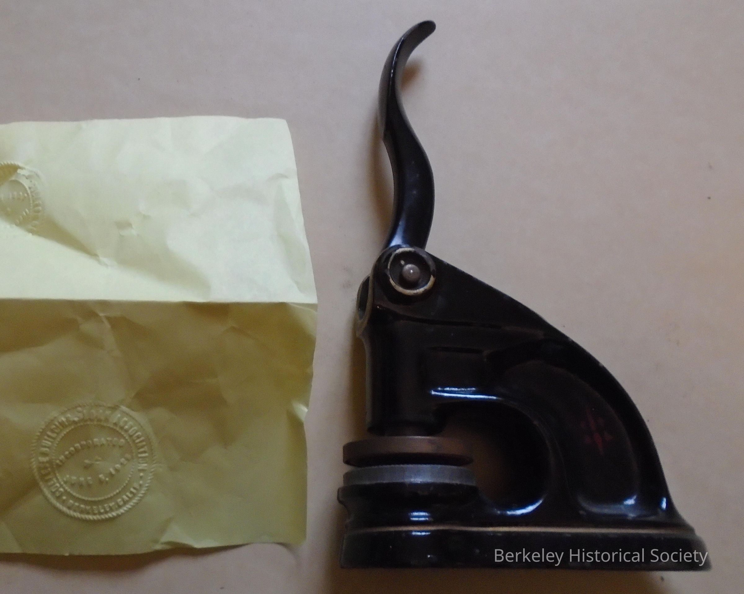Heavy, metal stamp for embossing paper with a circular mark " College Building & Loan Association Berkeley Calif Incorporated June 5, 1925". Lever handle and press action.