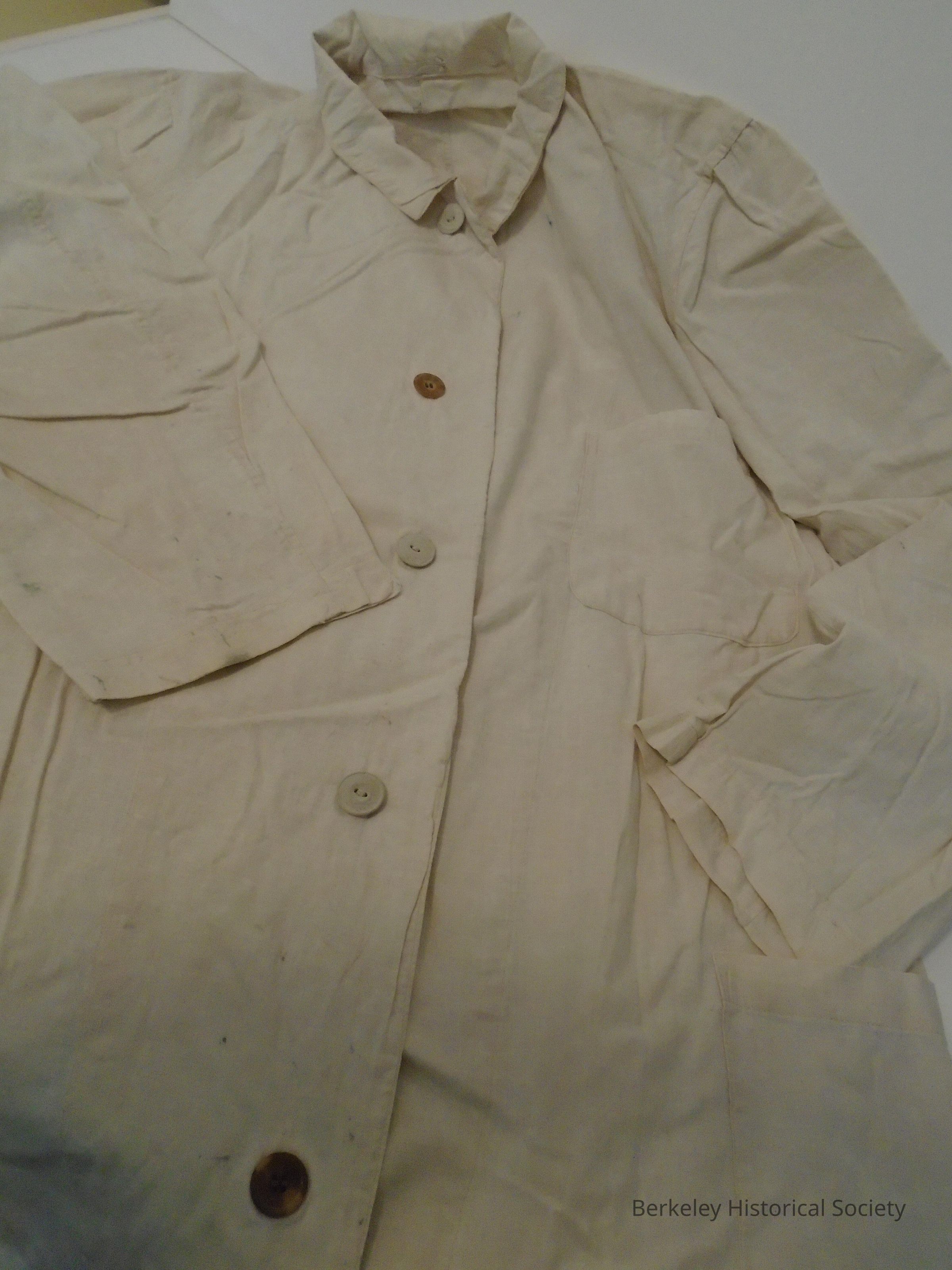 White cotton duster (coat/laboratory?). long sleeves, button down front with 3 square pockets.