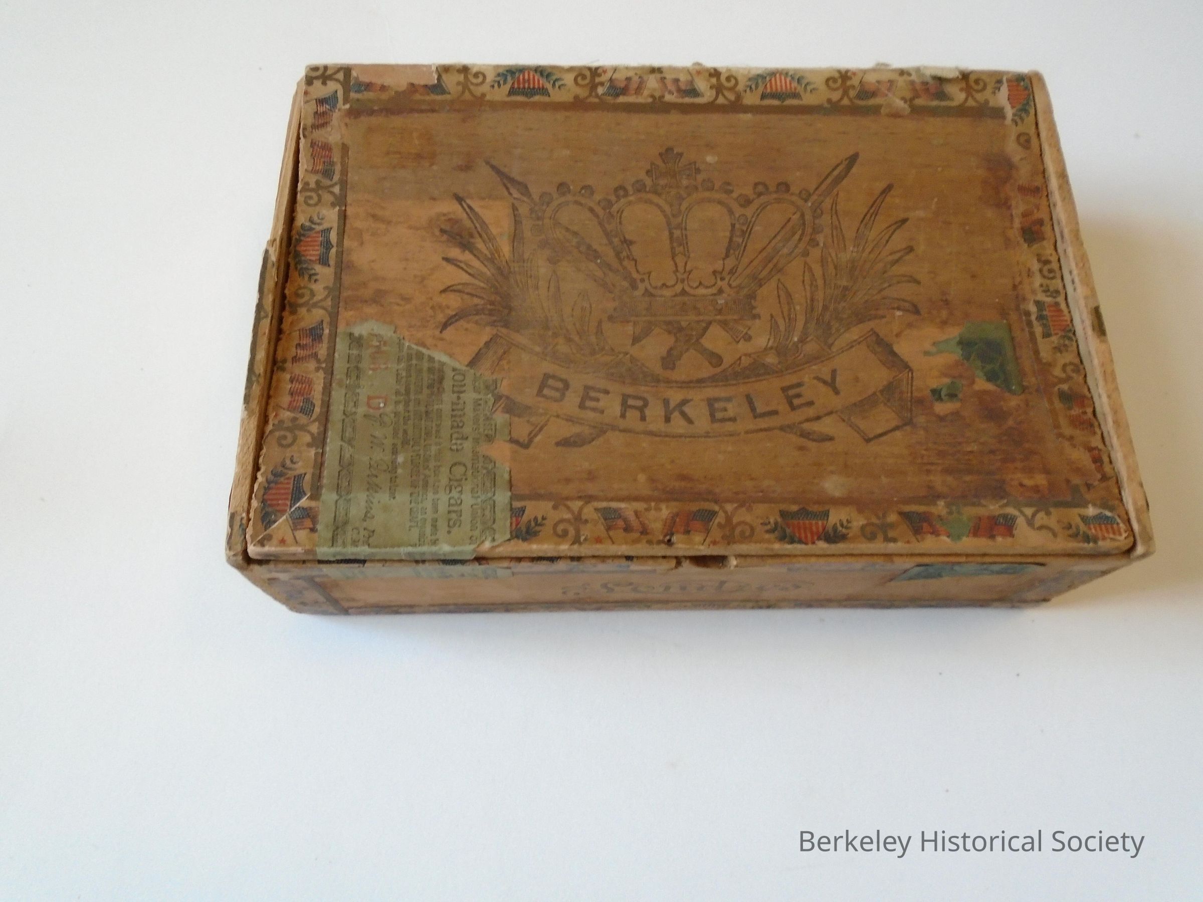 Wooden cigar box : Berkeley. Manufactured by F.G. Oellerich , 1825 Woolsey St., Berkeley, Cal. Seal shows Union Made, 1930. Sides show "Berkeley" and "Londres". Bottom of box "Factory No. 651 1st Dist of Cal. " and warning, seal etc. Decoration around edges of American flags (in color). Top center shows crown, swords, fronds (tobacco?) and "Berkeley" . Inside of top is mustard yellow paper with "High Grade 5 c (cent) Quality" and manufacturers name.Made/Created