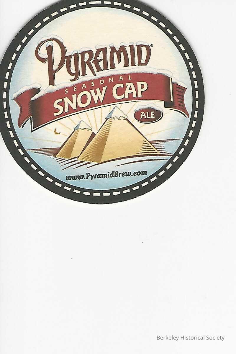 Cardboard beer coaster advertising Pyramid Snow Cap Ale. White, red and black with picture of 2 snow capped pyramids on the front and on the back, a description and "It's not winter without it. " Pyramid Brewery is located on Gilman St. in Berkeley.