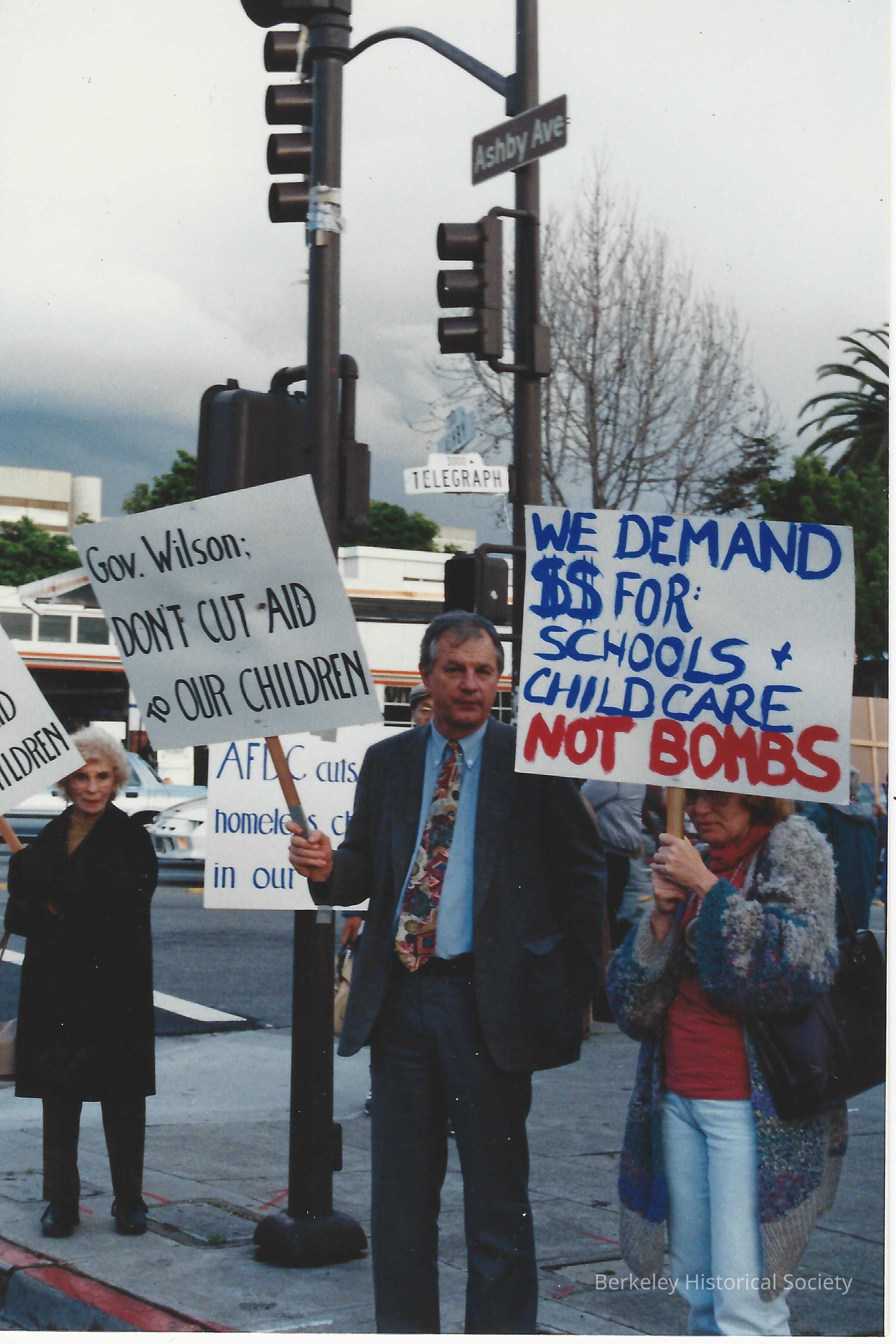 4 photographs. 2 formal portraits, one at opening of Bel Air [Motel?] by Noah Berger, one color photo, holding sign protesting school budget cuts by the state.