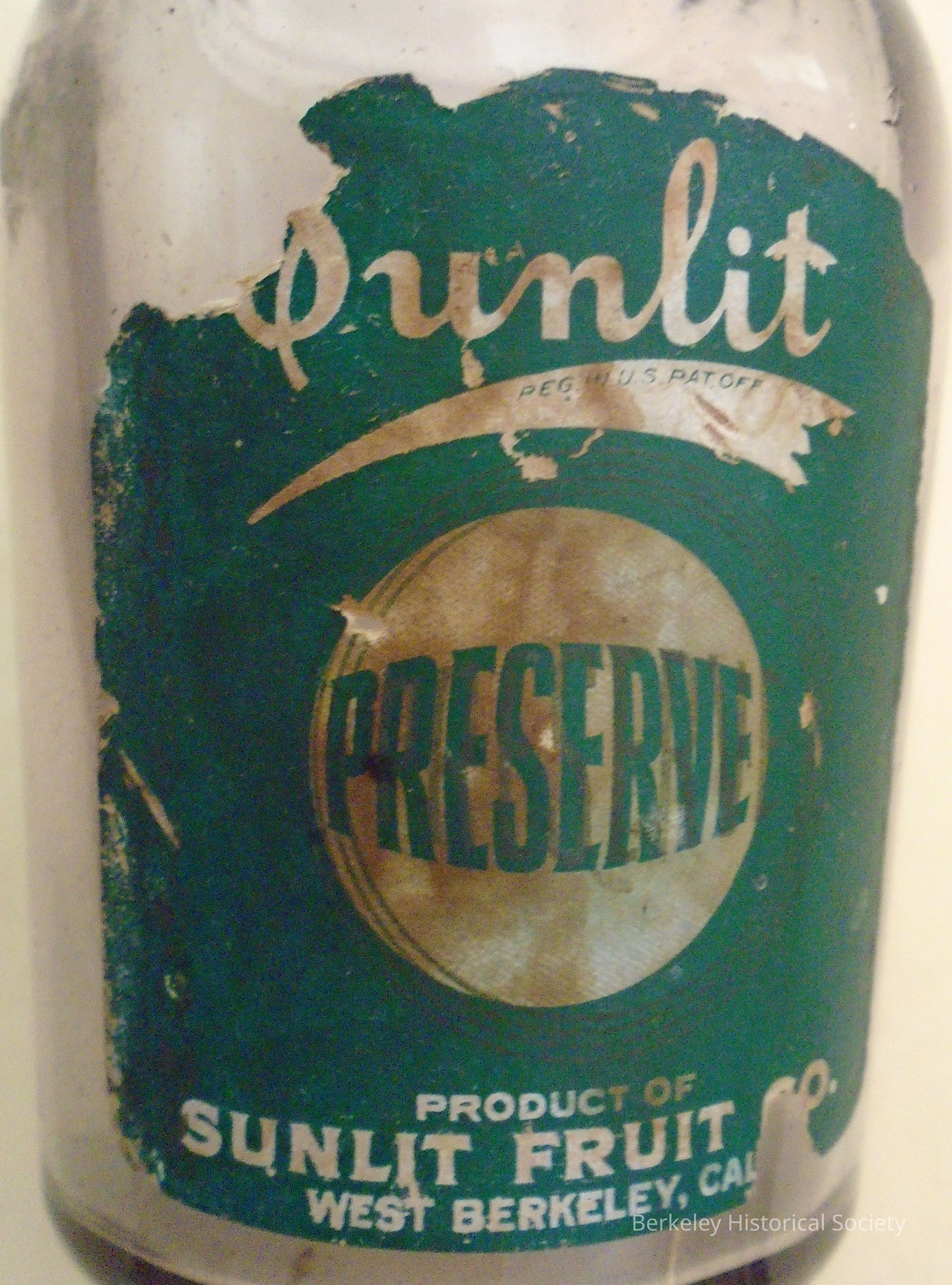 Glass jar for Sunlit Preserve, no lid. Green and white paper label reads "Sunlit Preserve, Product of Sunlit Fruit Co., West Berkeley, Calif". Company address was 2424 4th St. It was bought out by Del Monte in 1920 (California Packing Co.)Lexicon