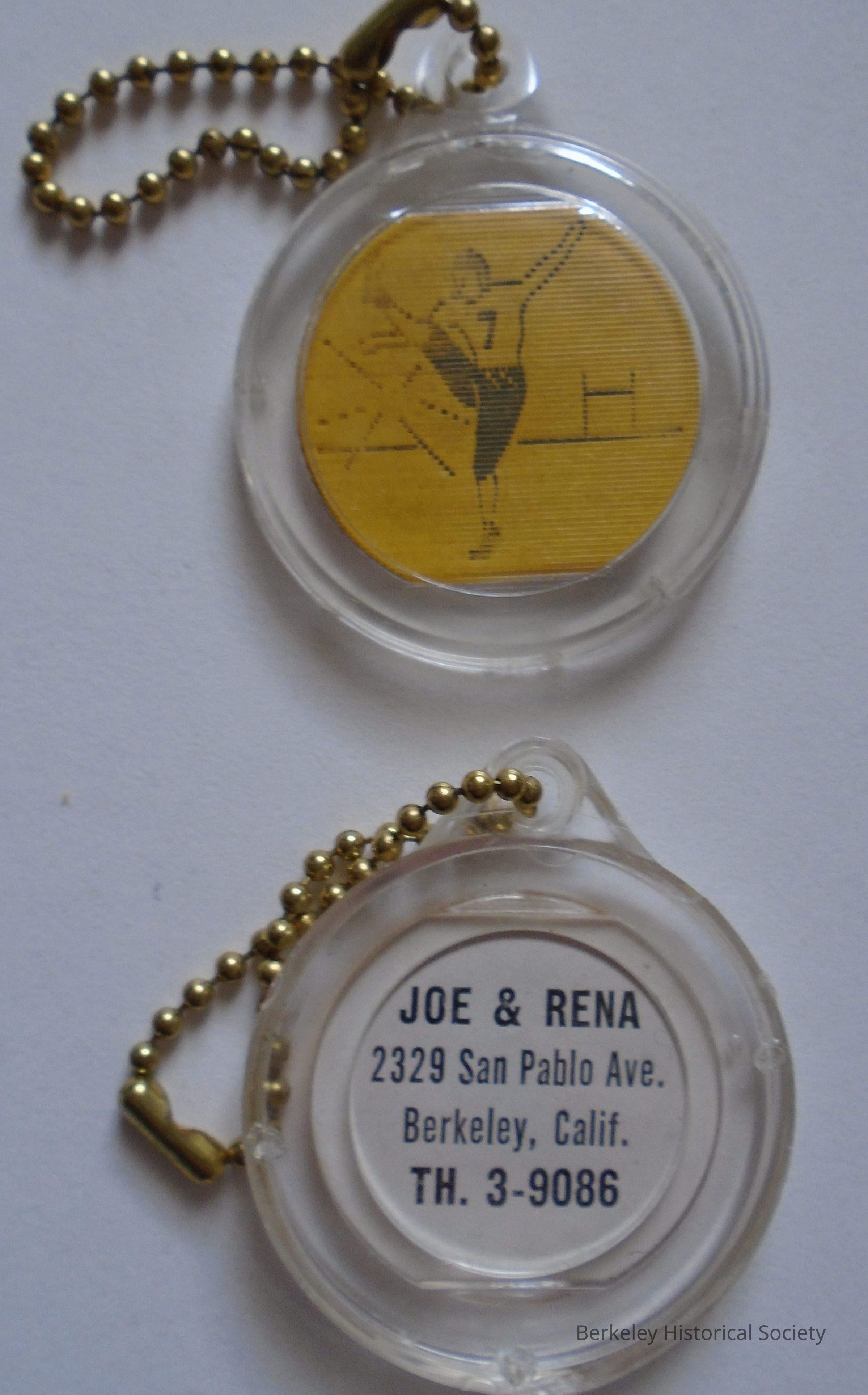 Joe & Rena (Palm Cafe) keychain with 2329 San Pablo Ave., Berkeley, Calif. TH. 3-9086 on one side. 1 of 4 keychains, each a different sport; this one: man kicking football. Moving the keychain changes the picture. Yellow paper in plastic, yellow metal chain.