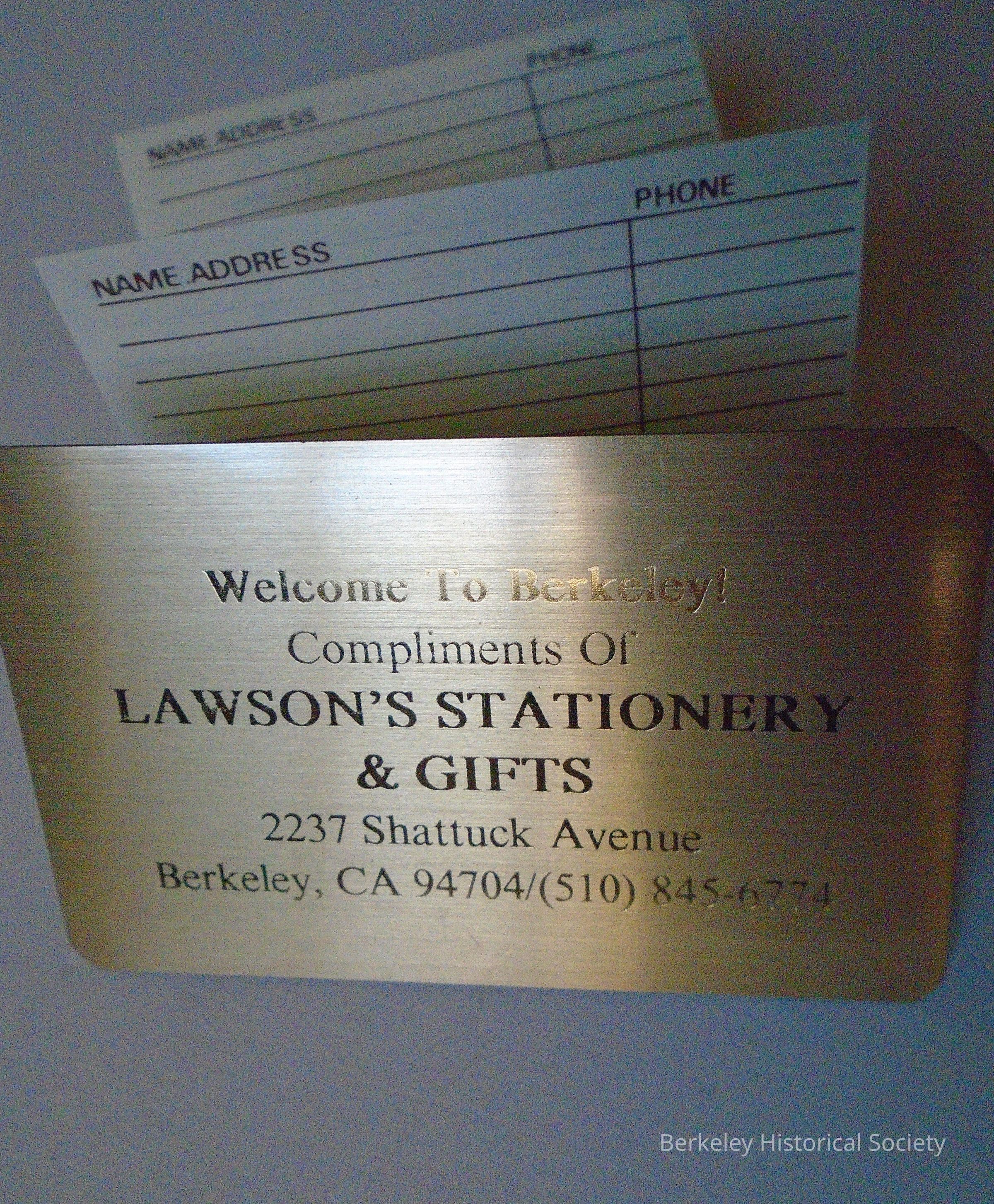 Address book with gold colored metal cover front and back with pages for addresses unfolding in the middle like an accordion. Front shows "Welcome to Berkeley! Compliments of Lawson's Stationery & Gifts, 2237 Shattuck Avenue Berkeley CA 94704 phone (510) 845-6774".