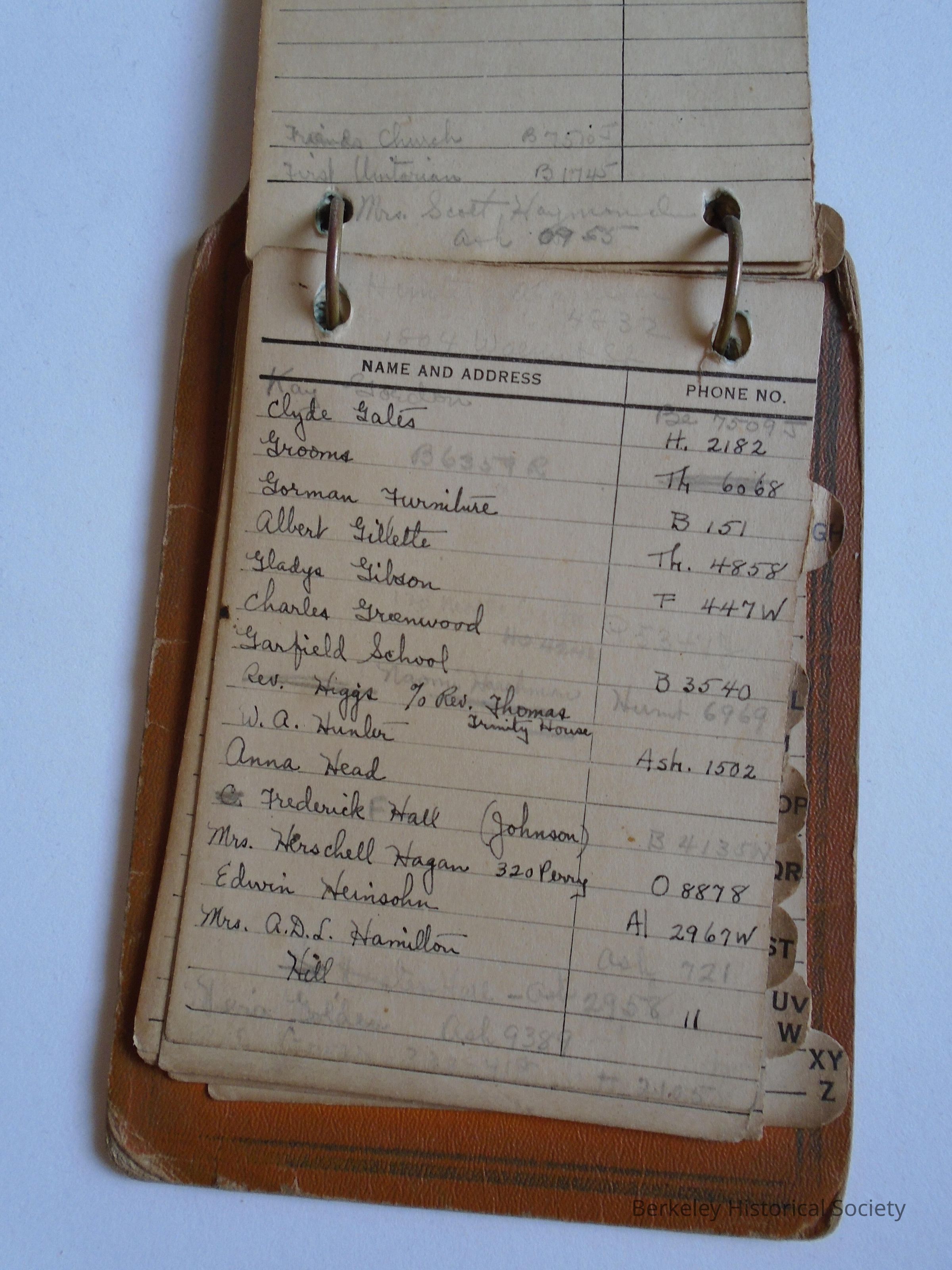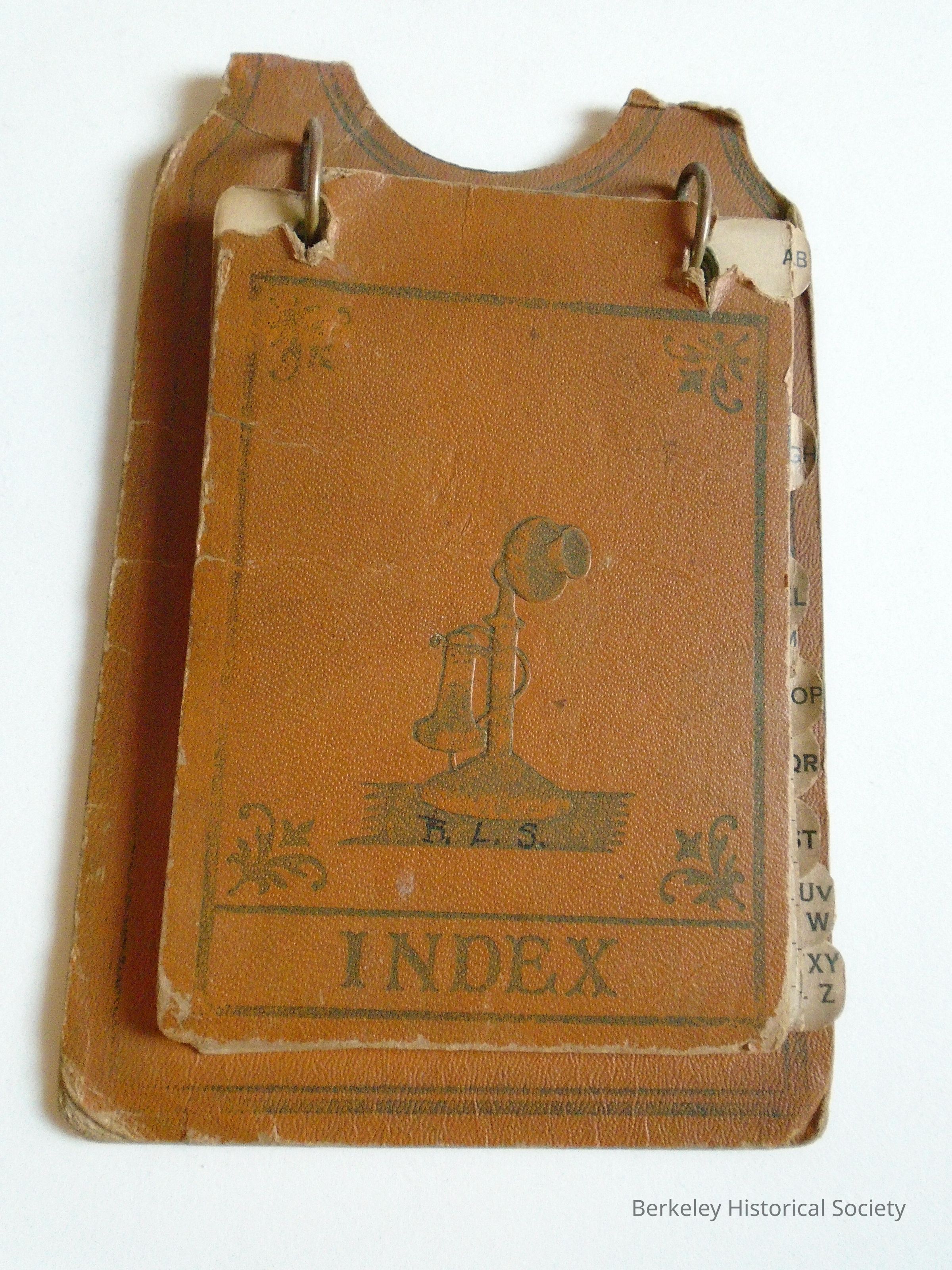 Personal address book made of cardboard (imitation leather look) and 2 binder rings. Picture of old phone on cover. Names of local schools, businesses and people. Most numbers are 1 or 2 letters and 4 numbers. B.L.S. written on front...unknown owner.