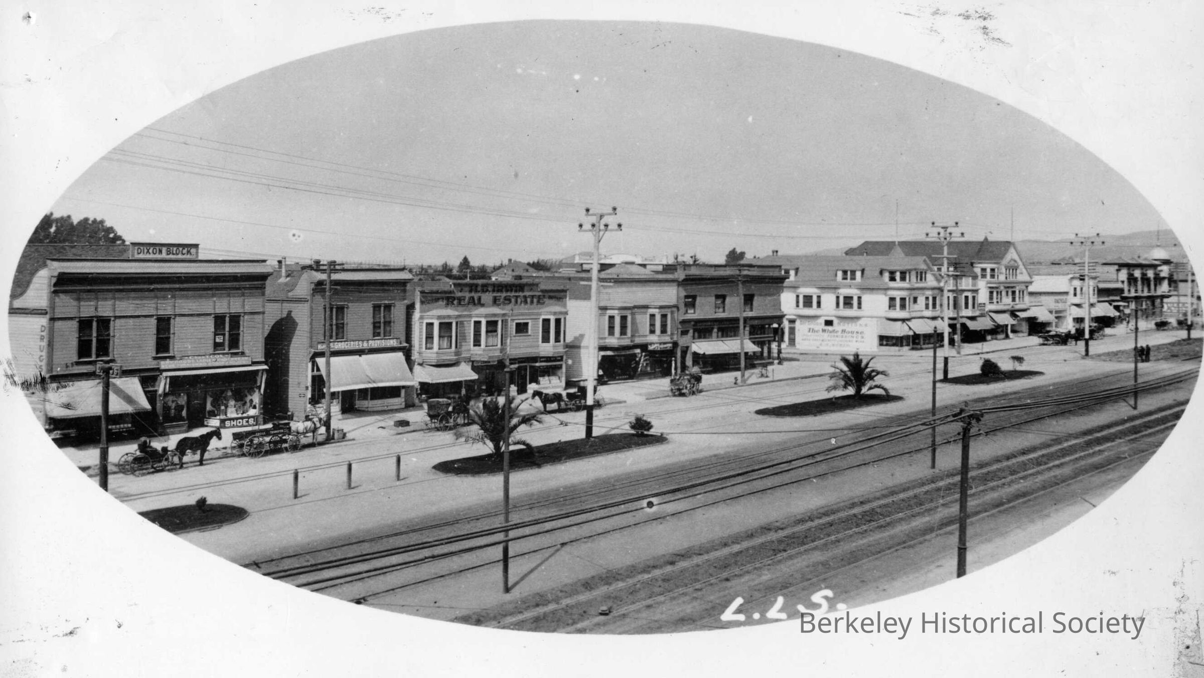 left to right; Lorin Drug Store, SW cor Harmon; Welden Shoe Store, 3238 Adeline; Lilienthal Grocery Store, 3228 Adeline; SP Station. 3266 Adeline; Irwins Real Estate, 3264 Adeline; Dixon Barber Shop, 3260 Adeline; Bank, Cox White House Department StoreLexicon
