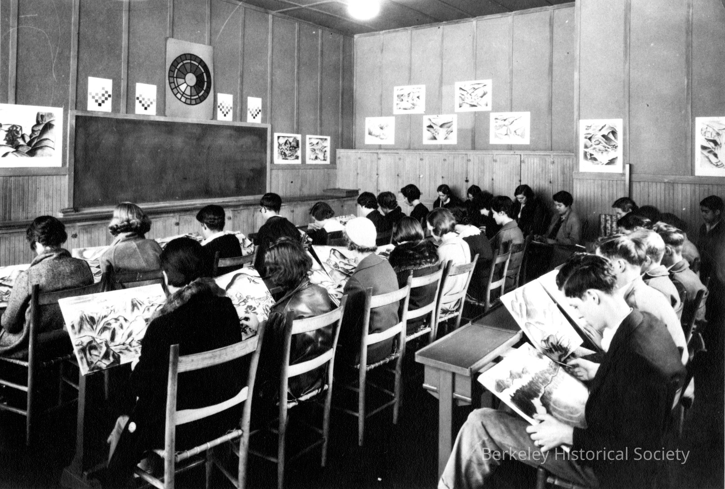 Classroom with art students in chairs each working on a project.Other Names and Numbers