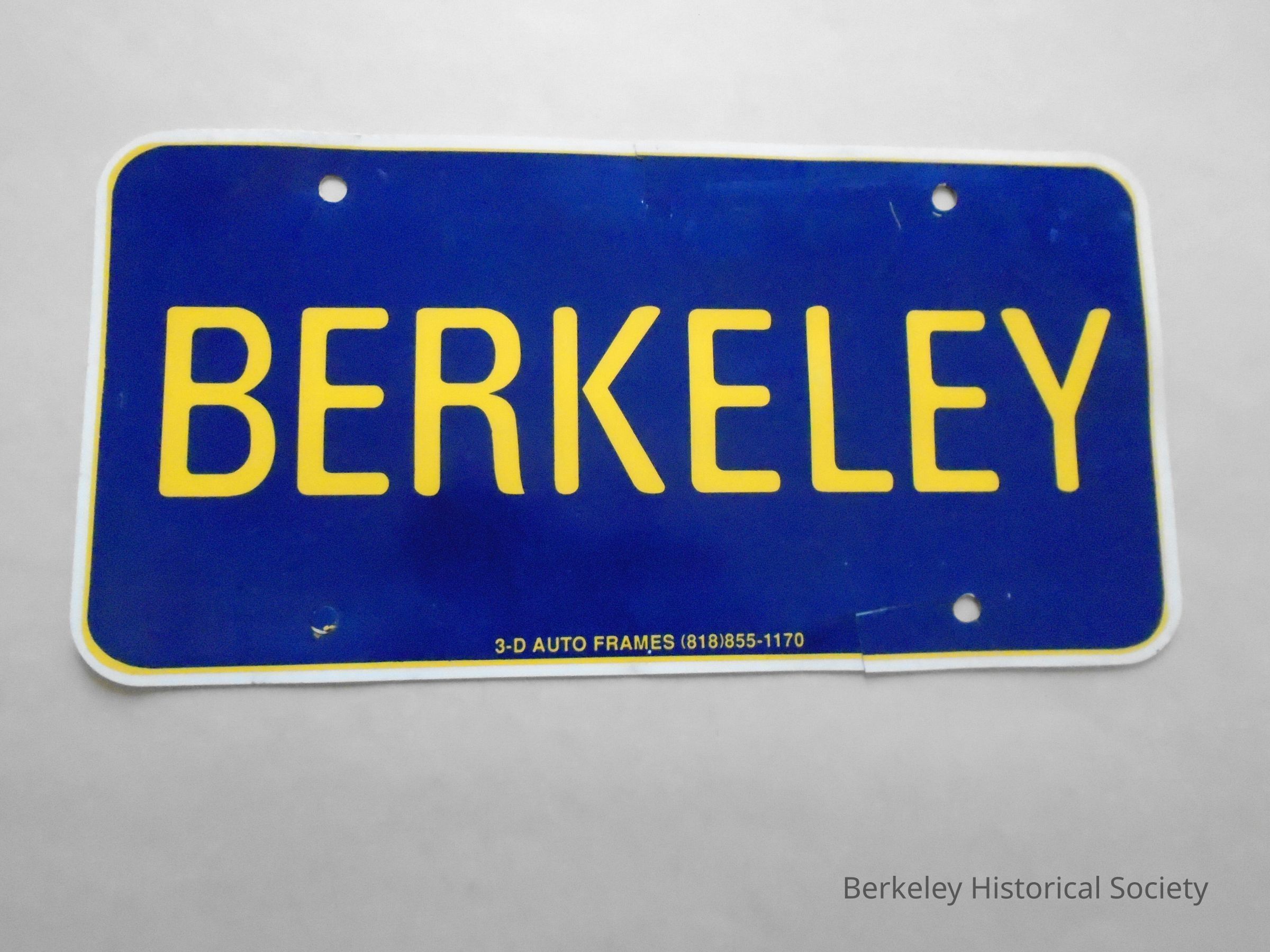 Plastic insert for auto license frame reading BERKELEY in gold with blue background. At bottom : 3-D Auto Frames (818) 855-1170. (no frame) See also 2009.049.001. Probably distributed by Toyota.