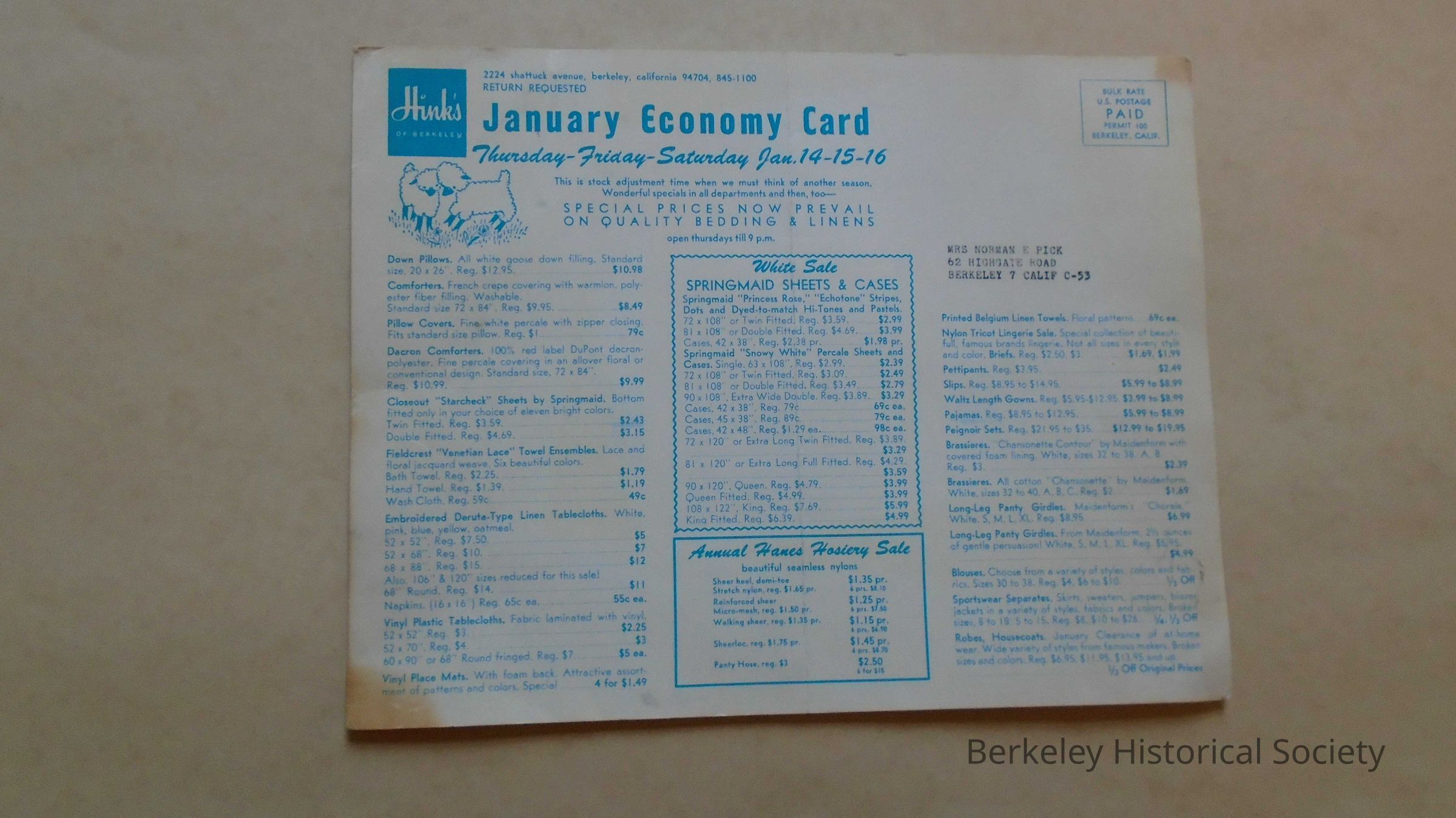Paper advertisement for Hink's, 2224 Shattuck Avenue, Berkeley, 94704. January Economy Card Thursday-Friday-Saturday Jan. 14-15-16. Two sided list of special prices for bedding, yarn, appliances, clothing. Mailed out (Mrs. Norman Pick. 62 Highgate Road, Berkeley 7 Calif.Lexicon