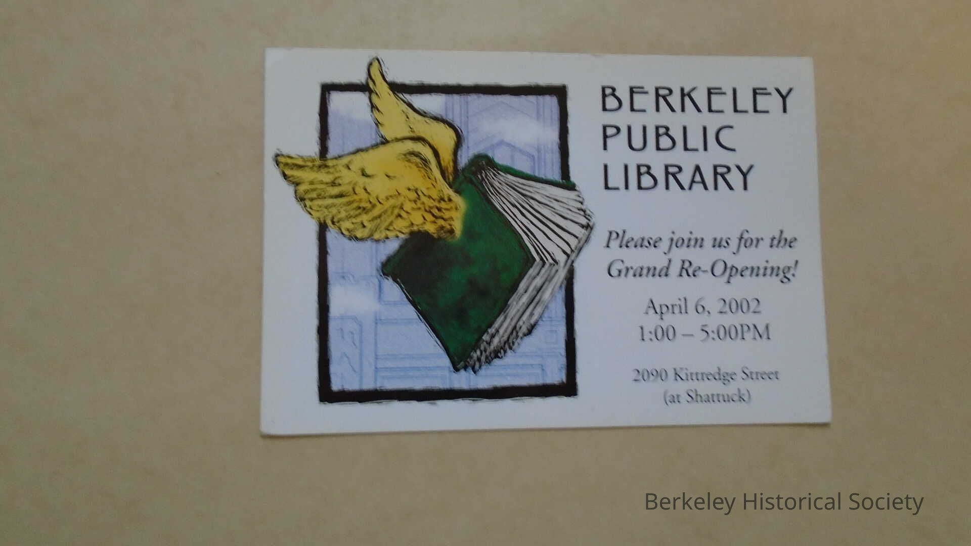 Paper card advertising Berkeley Public Library re-opening. "Please join us for the Grand Re-Opening! April 6, 2002, 2090 Kittredge Street (at Shattuck)." Major remodel/rehab. Picture of a book with wings.Lexicon