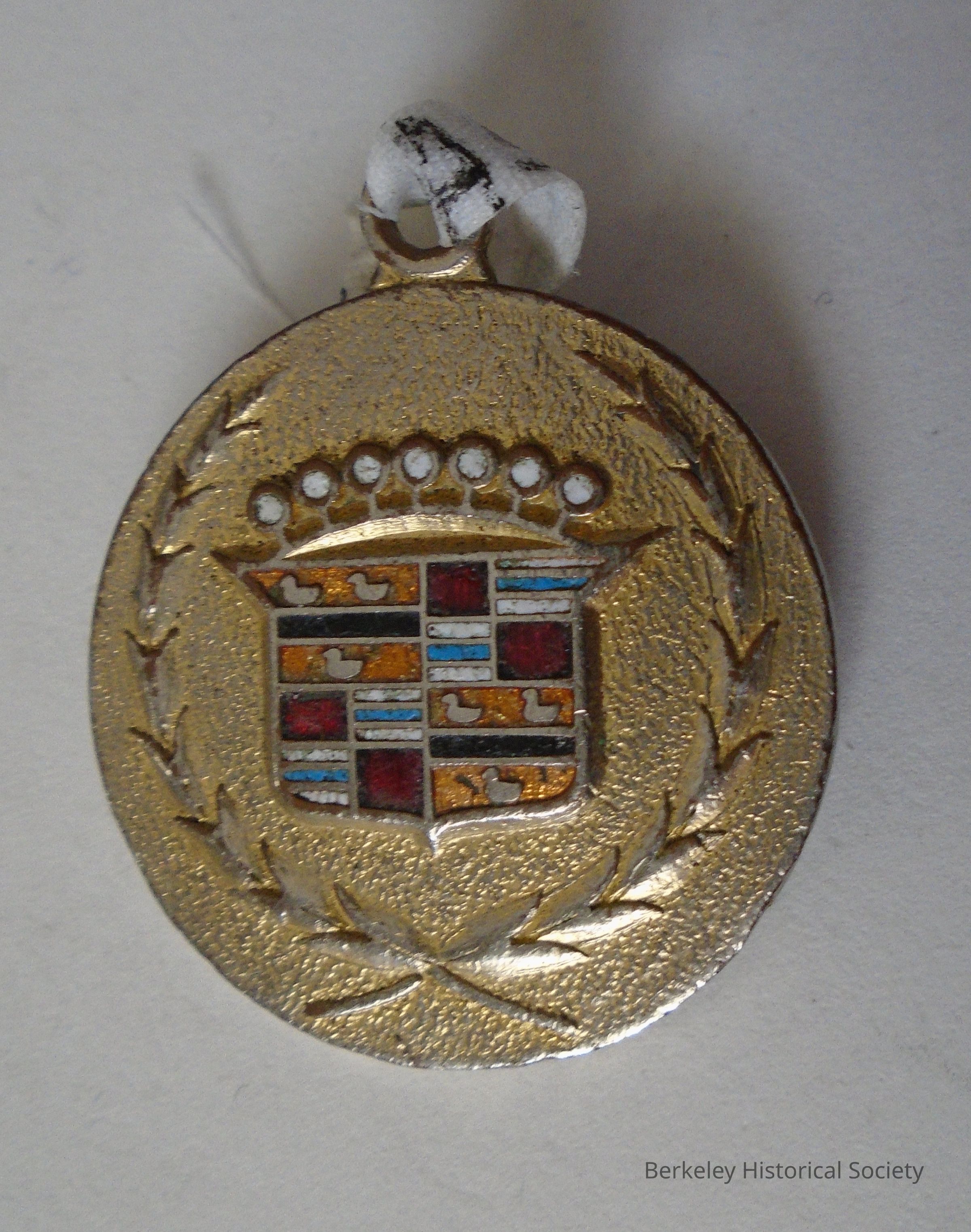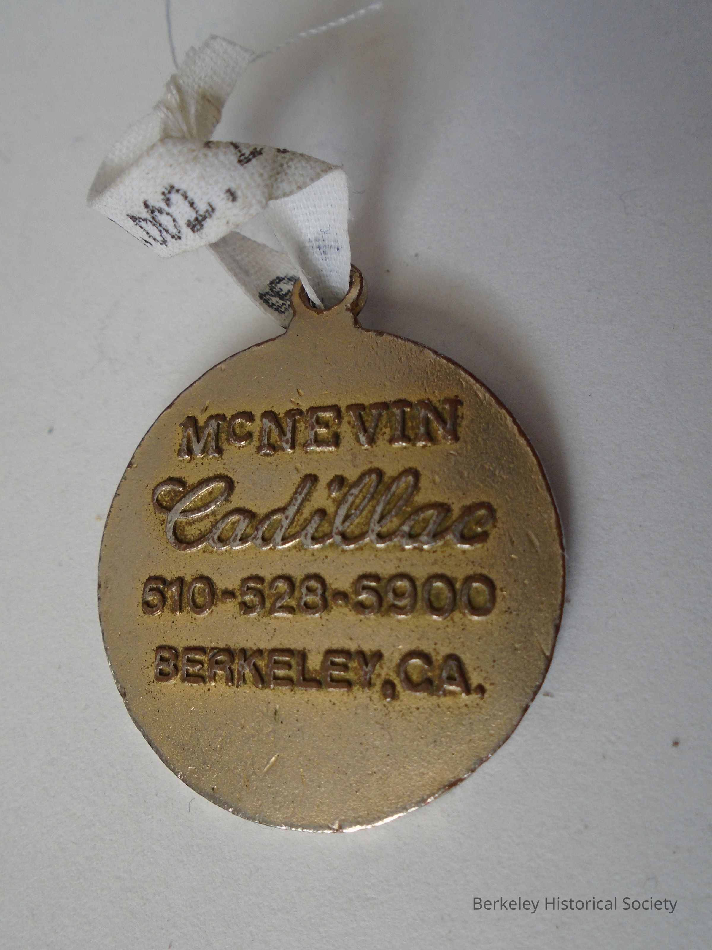 Round, gold colored metal advertising medallion. Cadillac symbol on one side in orange, red, turquoise and white. On the other side: "McNEVIN Cadillac 510-528-5900 Berkeley, CA". Perhaps meant for a keyring.Made/Created