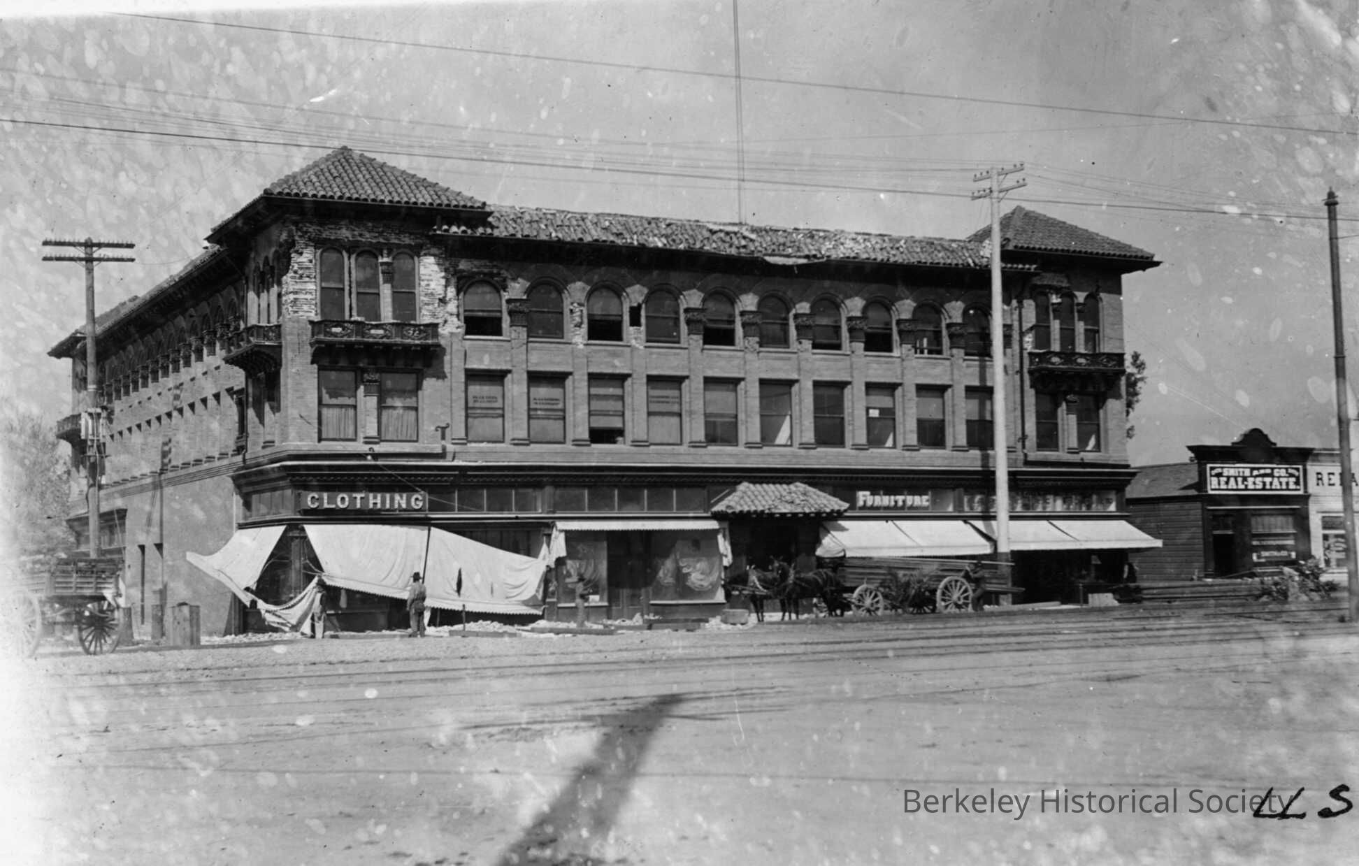 Corner store, rubble, fallen awnings. Far view and near view (two photos). 2486 Shattuck Avenue.Made/Created