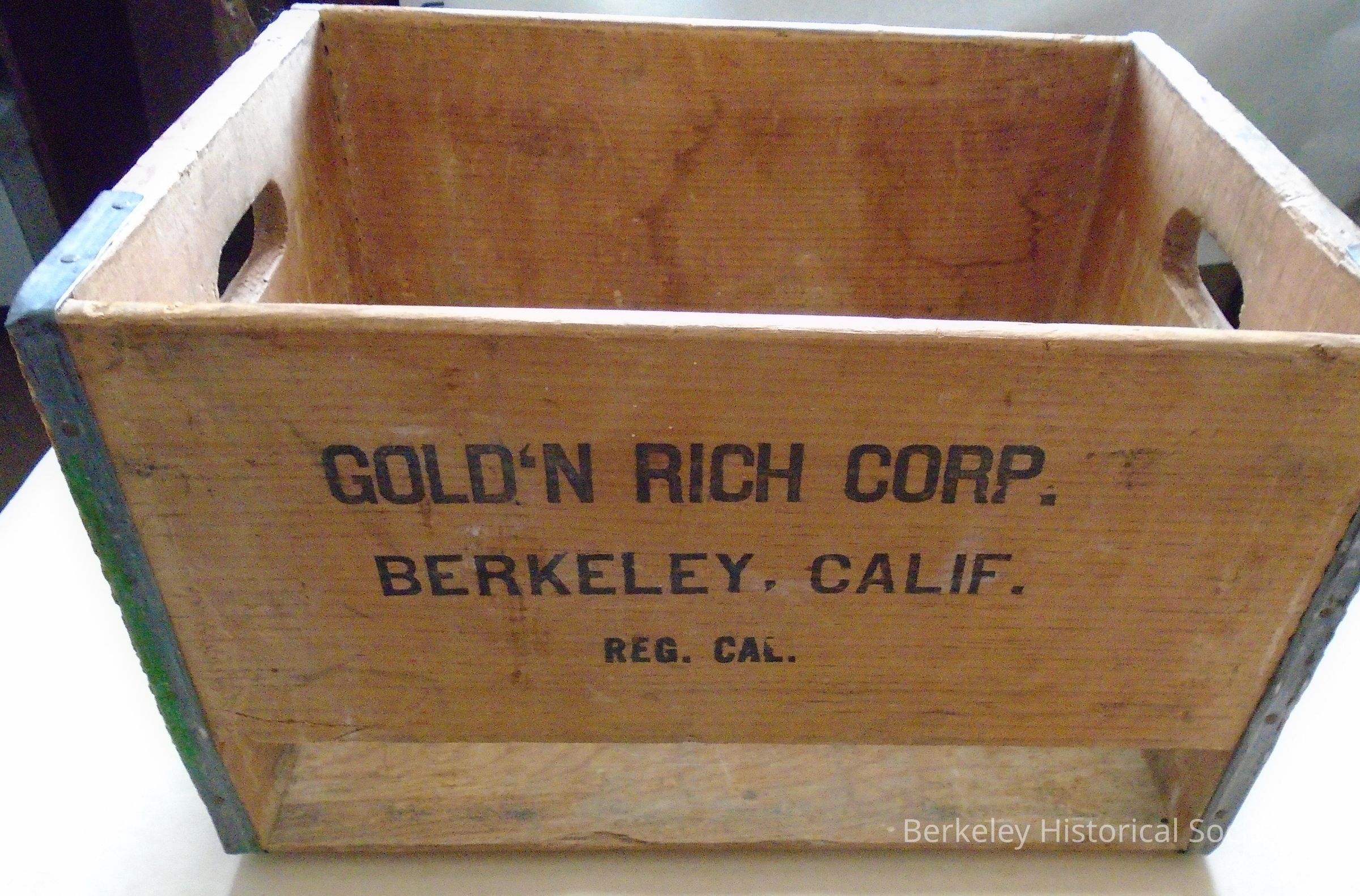 Sturdy, open wood crate with the name Gold'n Rich Corp, Berkeley, Calif. on it. Name is imprinted on each side. Metal strips on one side. Hand slots on each end.Made/Created