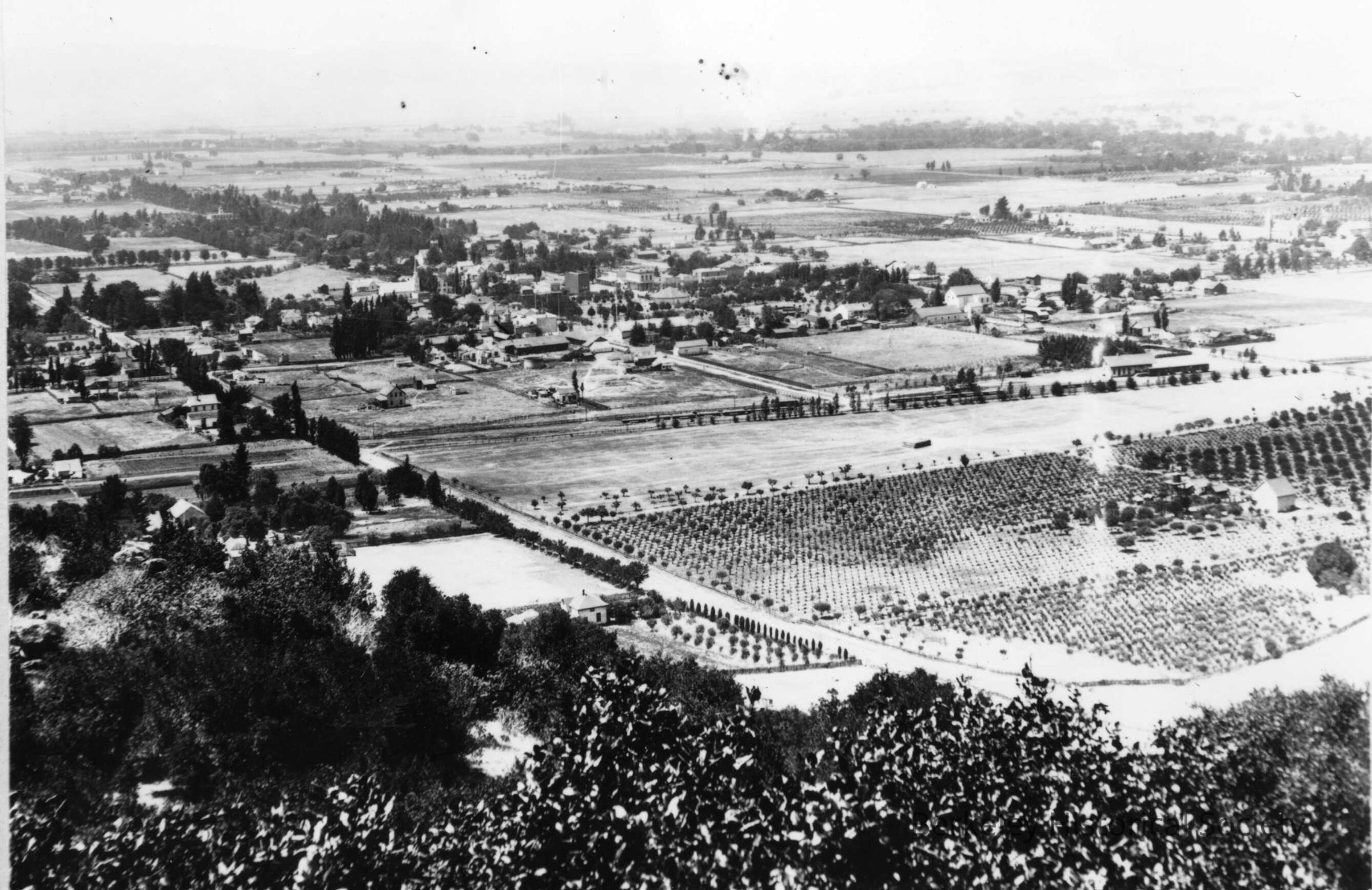 Aerial, View of Albany area taken from northeast slope of El Cerrito Hill facing Berkeley. Note faint outline of hills and what appears to be Peralta Hotel (near Sacramento and Hopkins) and Codornices Creek in center.
