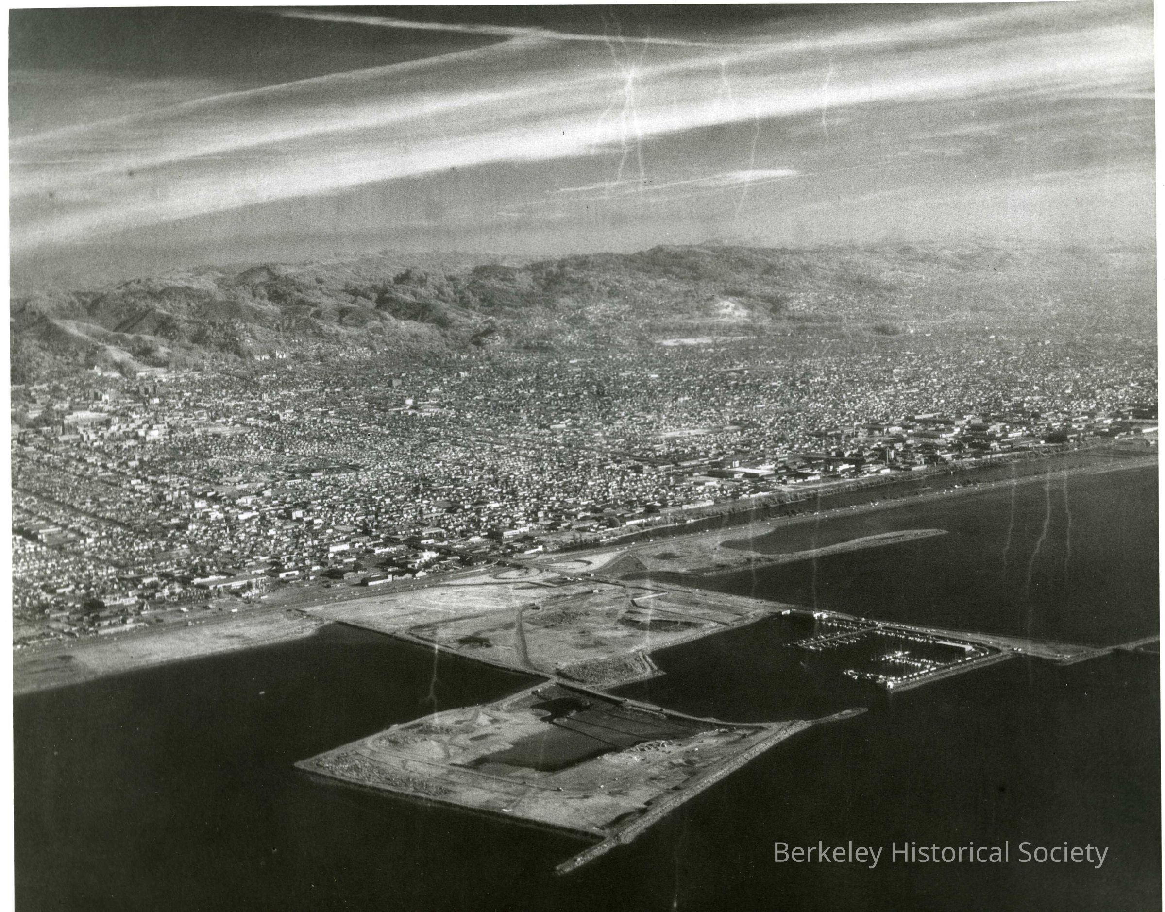 Aerial view 1962 Berkeley Oakland - Bay to East Bay Hills looking S.E. Berkeley Harbor in development