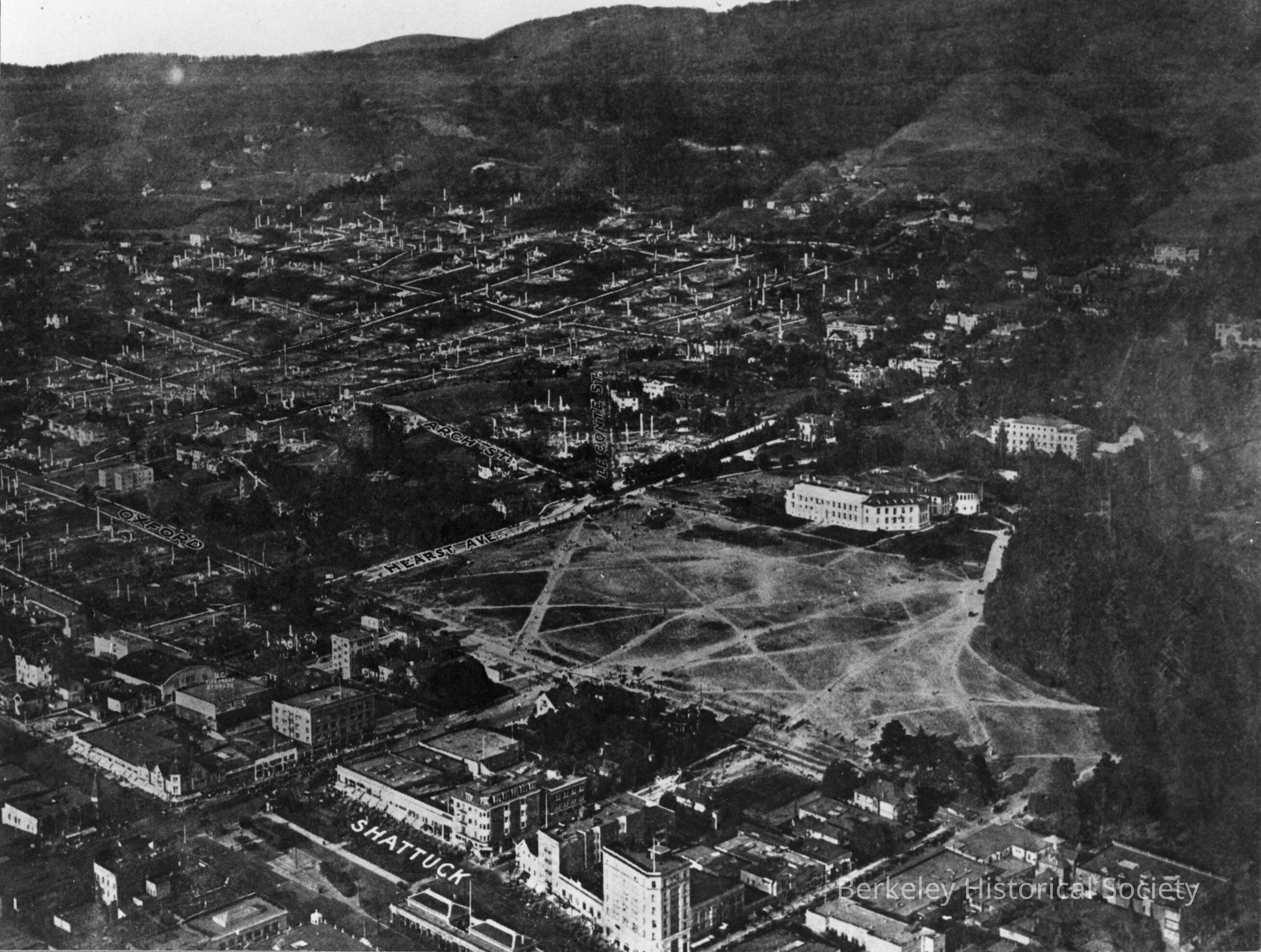 View from over downtown looking northwest to fire damaged area. Shattuck Avenue and UC campus in foreground.Dimensions