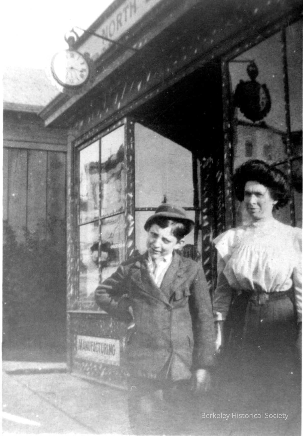 Alfred Fields and his mother standing outside of watch store on Vine St.