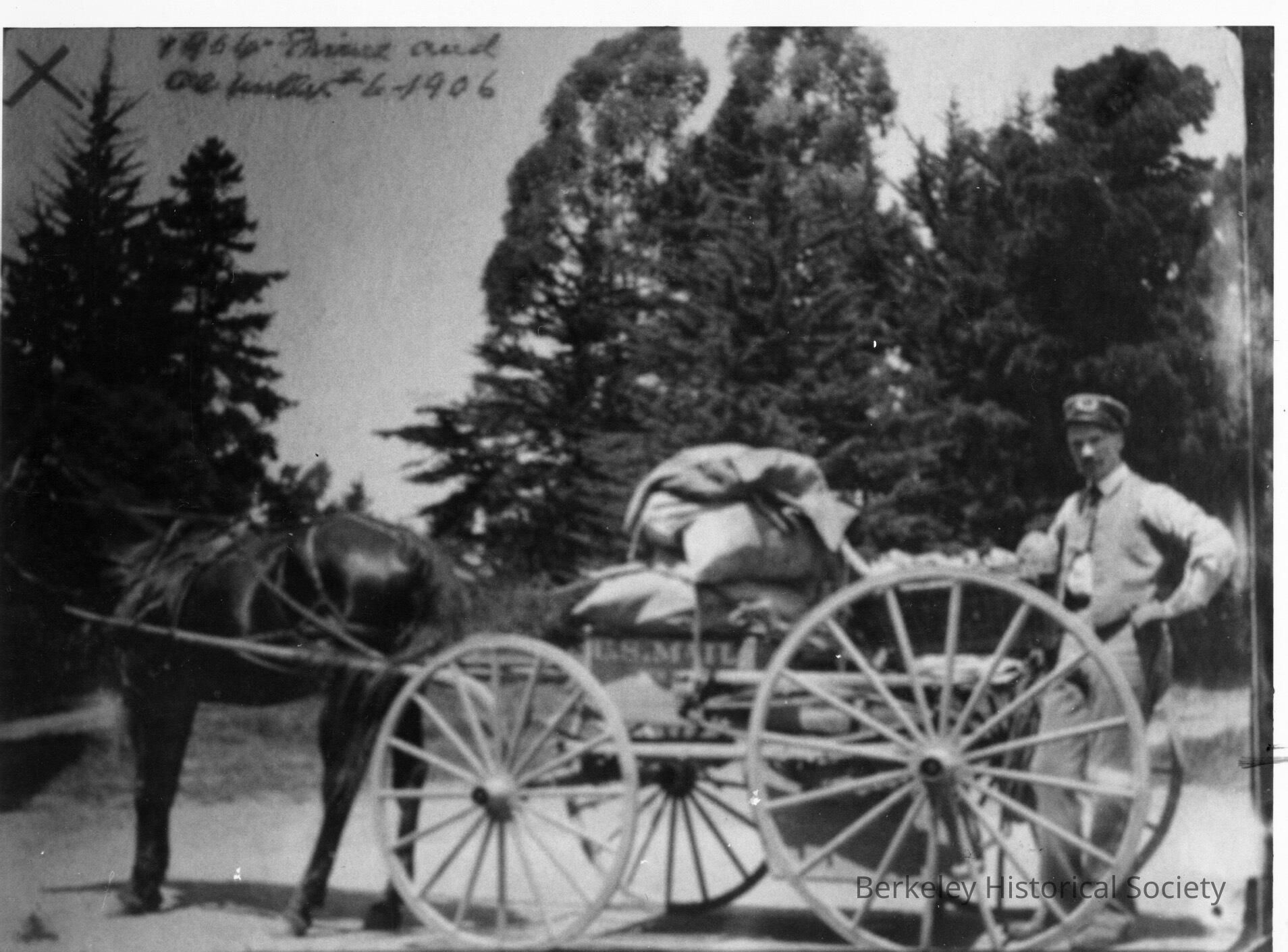 Al Miller, University of California mailman, and horse, Prince; delivery piled on wagon.Made/Created