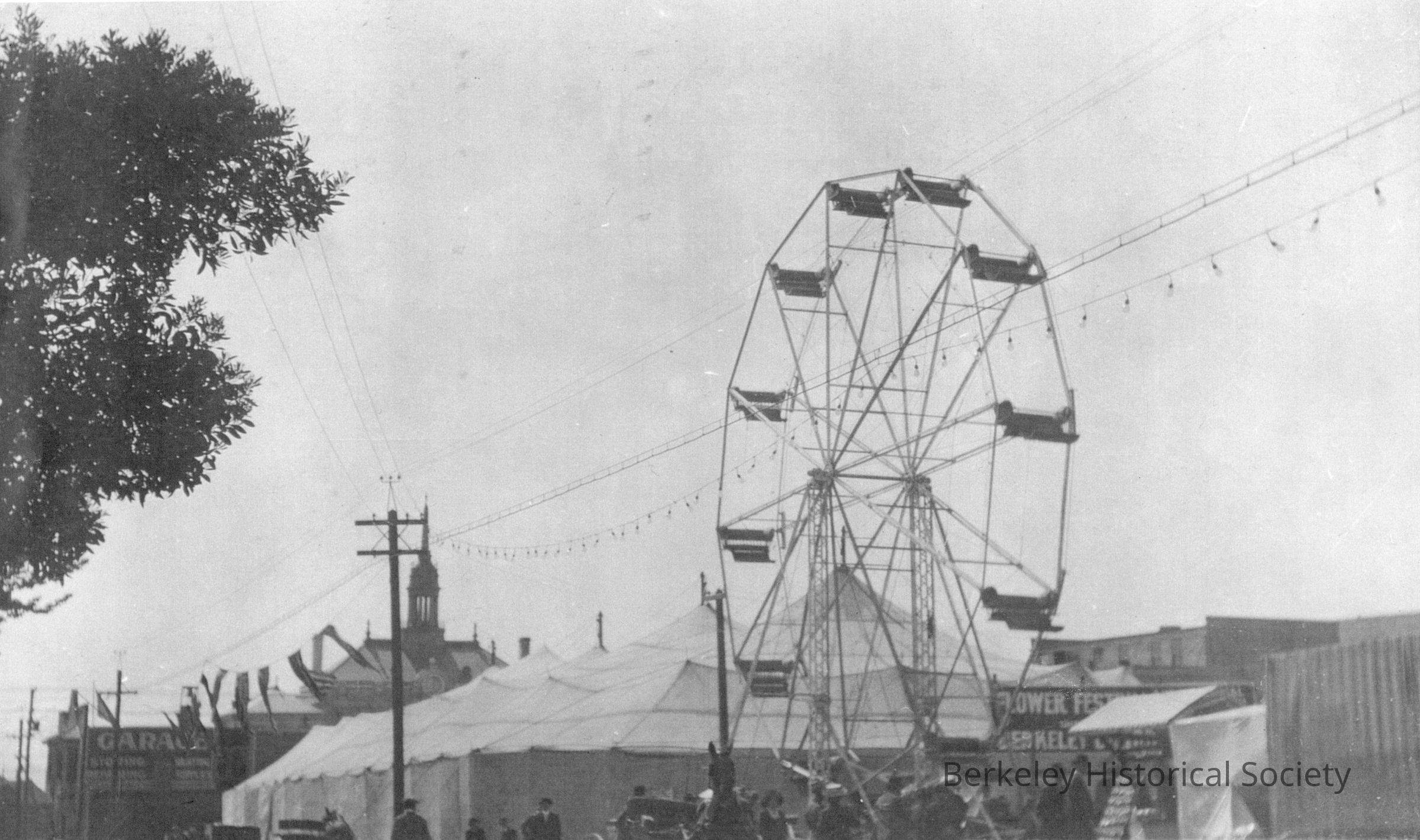 Ferris wheel, large tent and other structures, with City Hall in background. Probably on Allston Way, below Milvia Street. Partially visible sign near tent: Flower Festival.