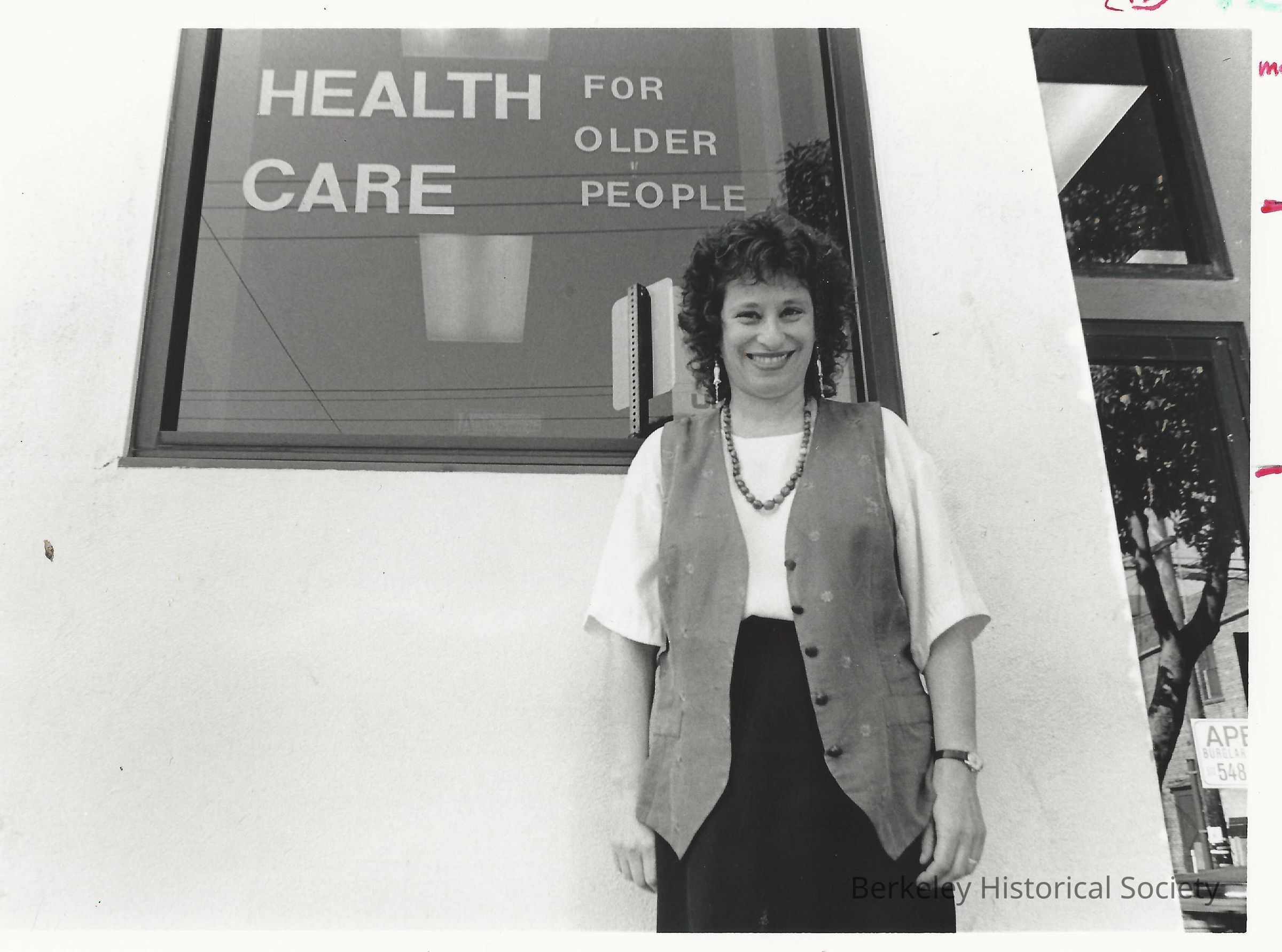 On verso: in front of her Over 60 Clinic. Sign on building: Health Care for Older People. Undated.