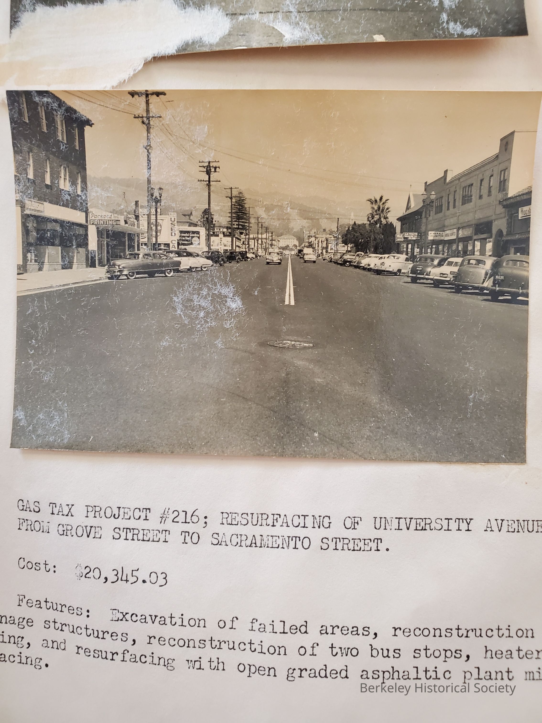 Include some photographs of work on Sixth Street, Ninth Street, Dwight Way, University Avenue, Grove Street, Arlington (Marin) Circle. Also a few photos of equipment, new street signs and stop signs.Lexicon