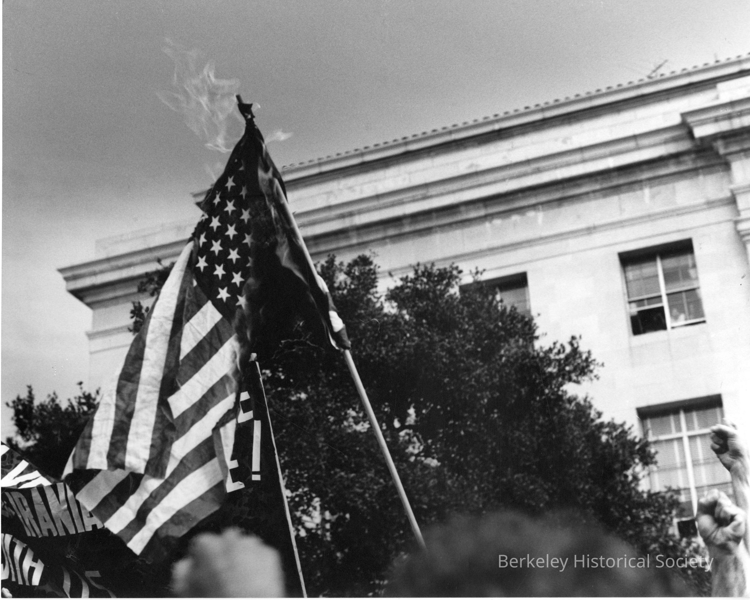 Flag burning; flag held alofe, in front of Sproul Hall, University of California campus.