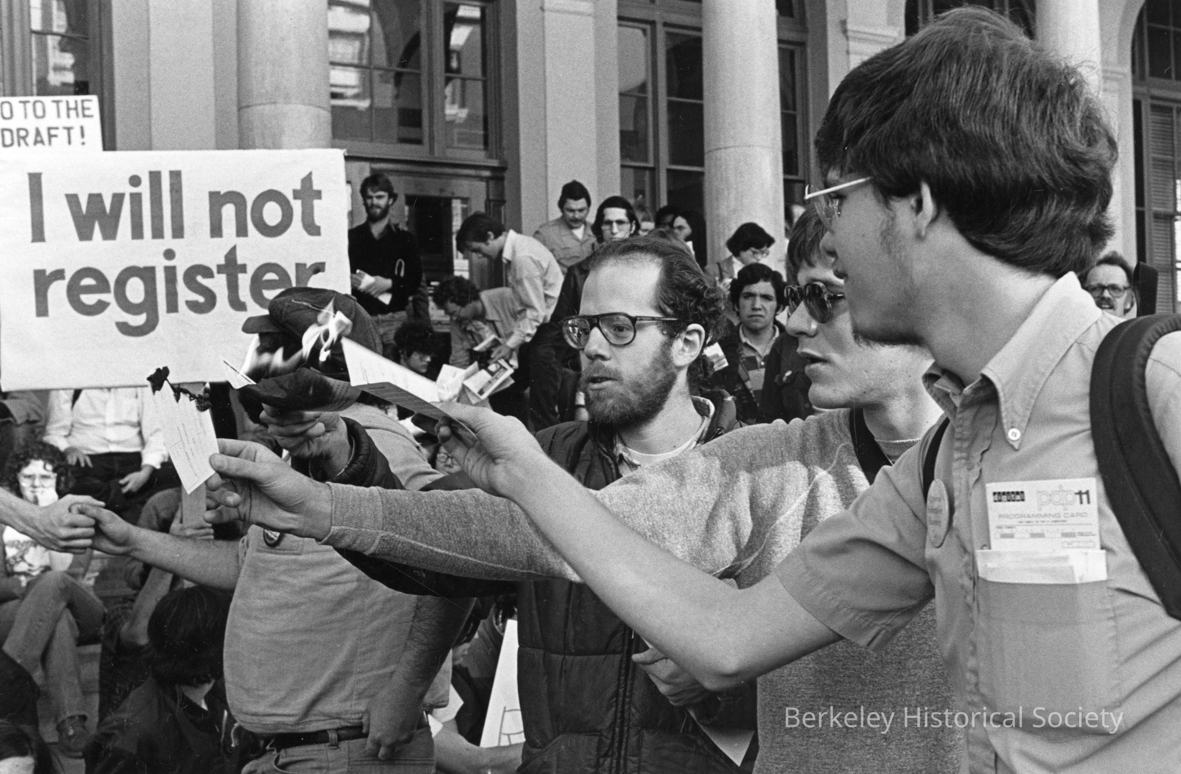 Several people burning draft forms in front. of Berkeley Post Office: Harvey Grosser. Dam O'Leary, Michael Chastain.