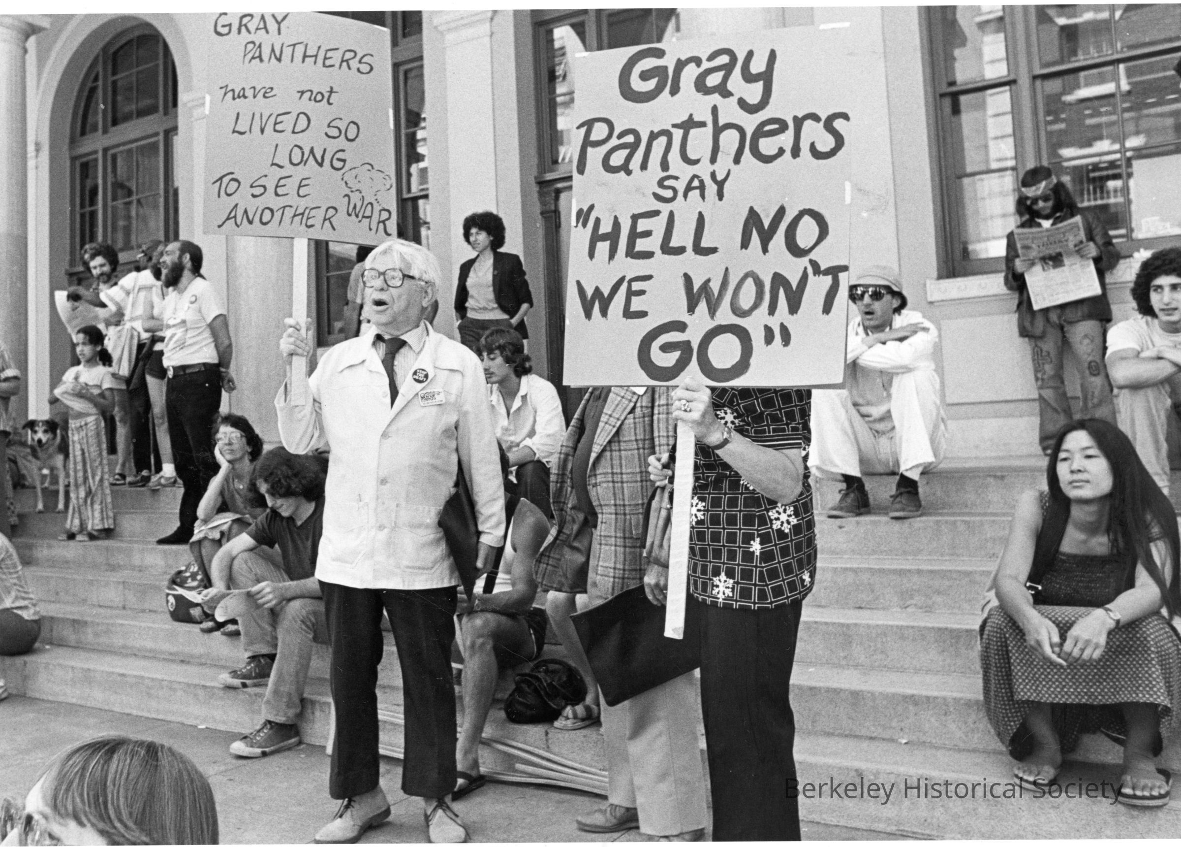 Gray Panthers holding anti-war signs on steps of Berkeley Post Office.