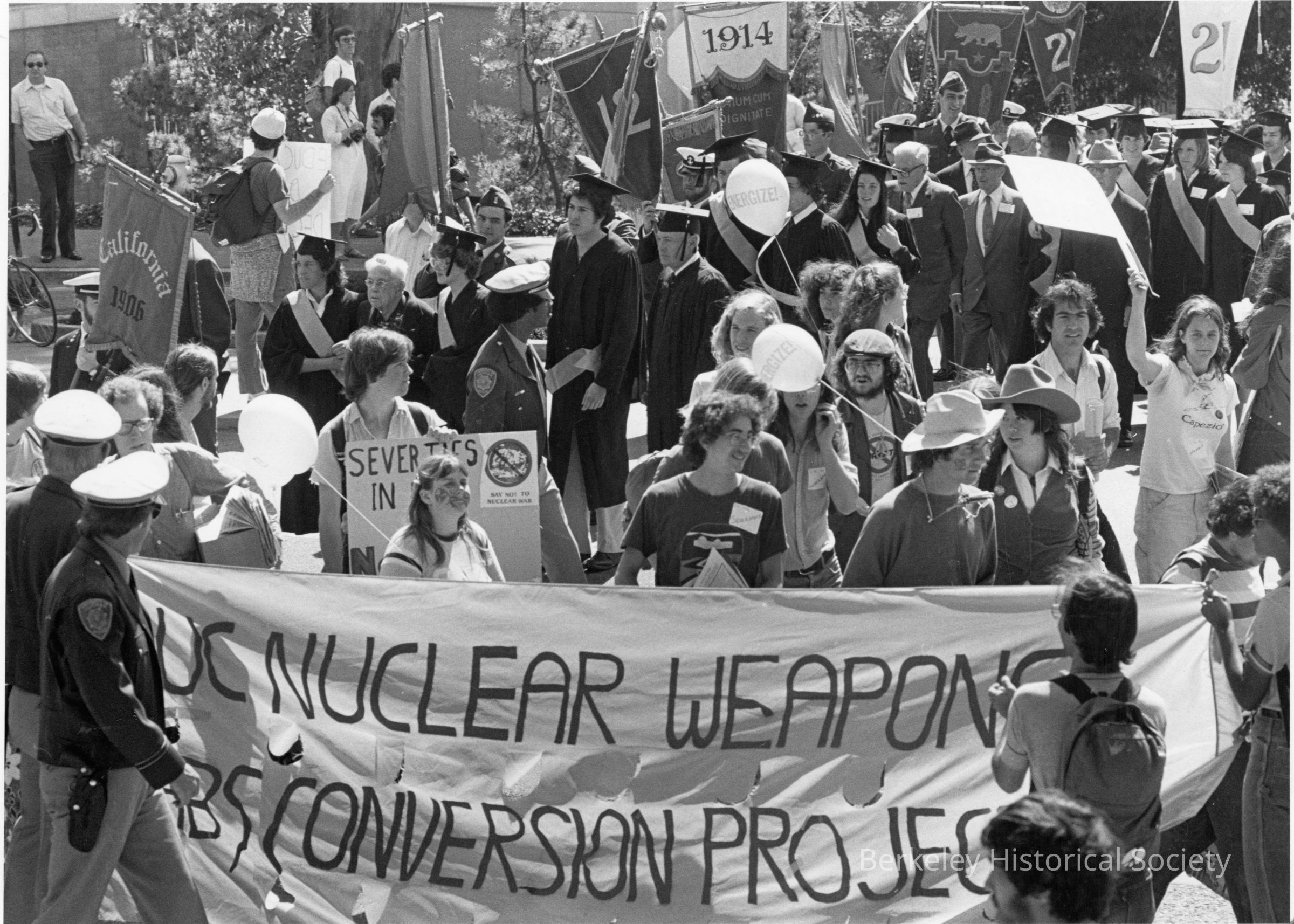 Protest on UC Charter Day, with class signs and academic procession and protesters.