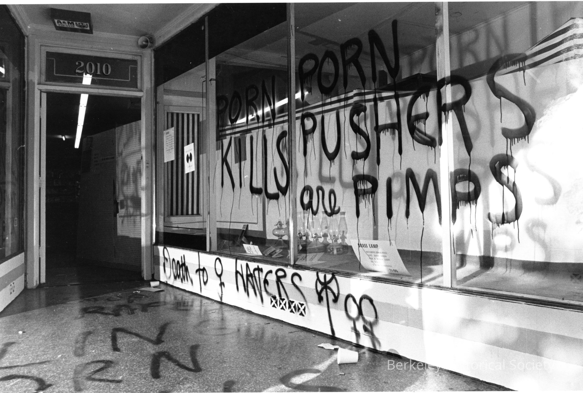 Storefront at 2010 Shattuck Avenue vandalized with anti-porn slogans.
