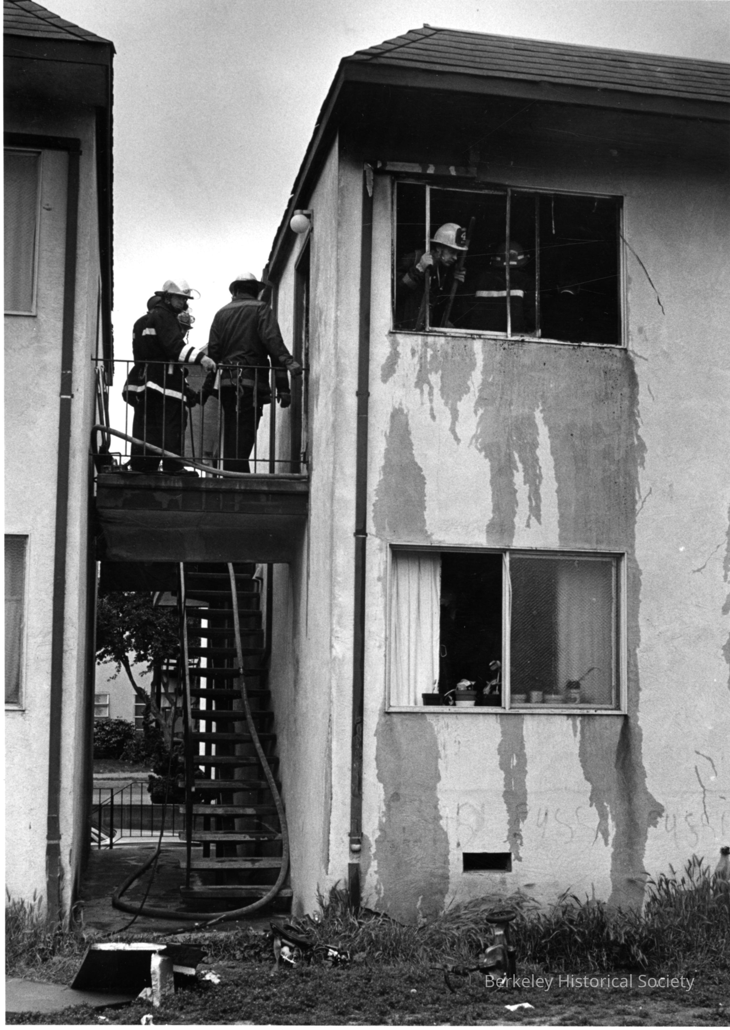 Firemen inspecting apartment, on second floor exterior landing and at window in building.