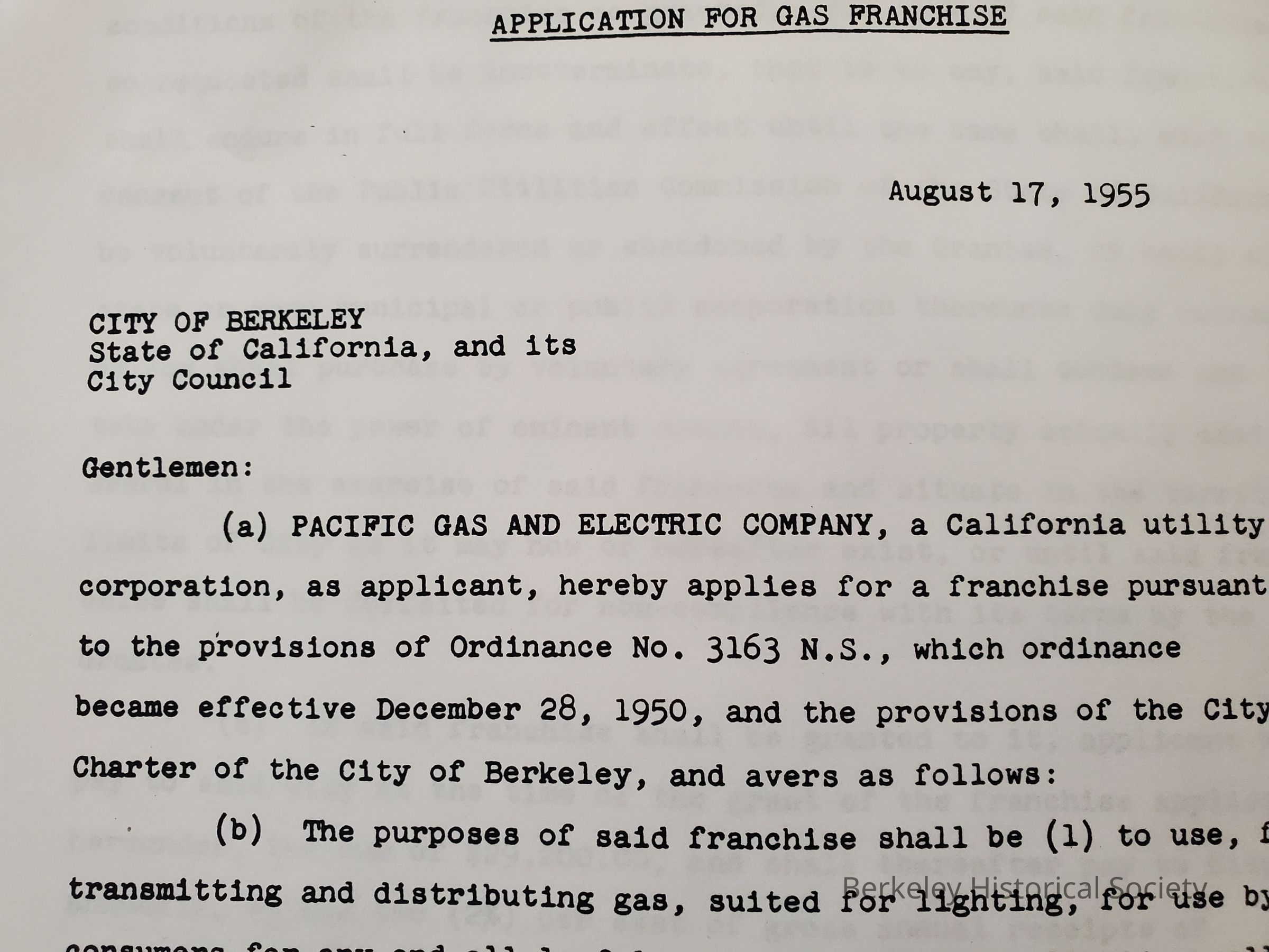 Application for gas franchise from the city of Berkeley, with varioius emendations and certifications. There is also mention of the franchise for electricity.