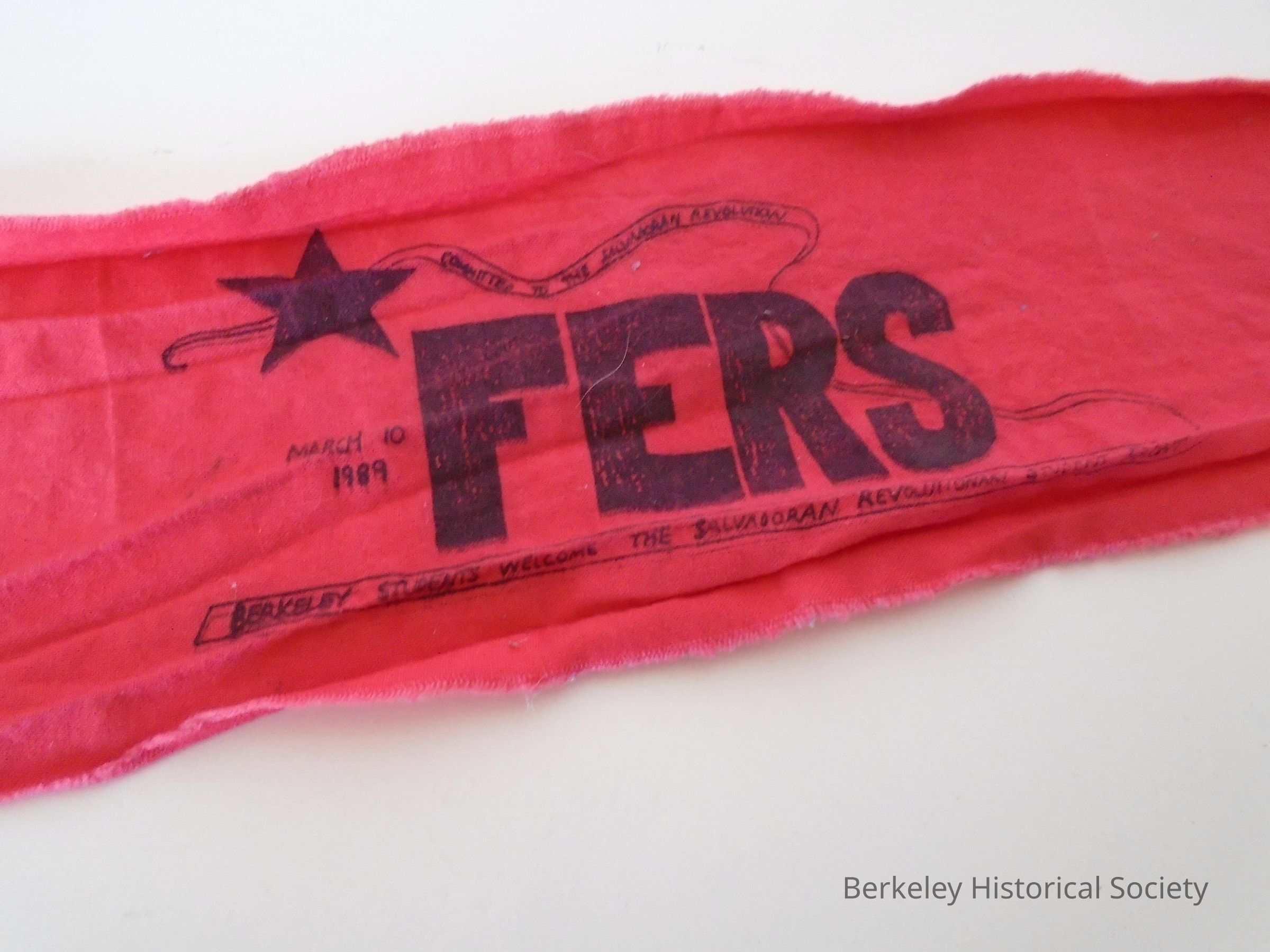 Red cotton armband with black text: FERS (Fronte Estudiantes de la revolucion Salvadorena) , Berkeley students welcome the Salvadoran Revolutionary student front, March 10, 1989.