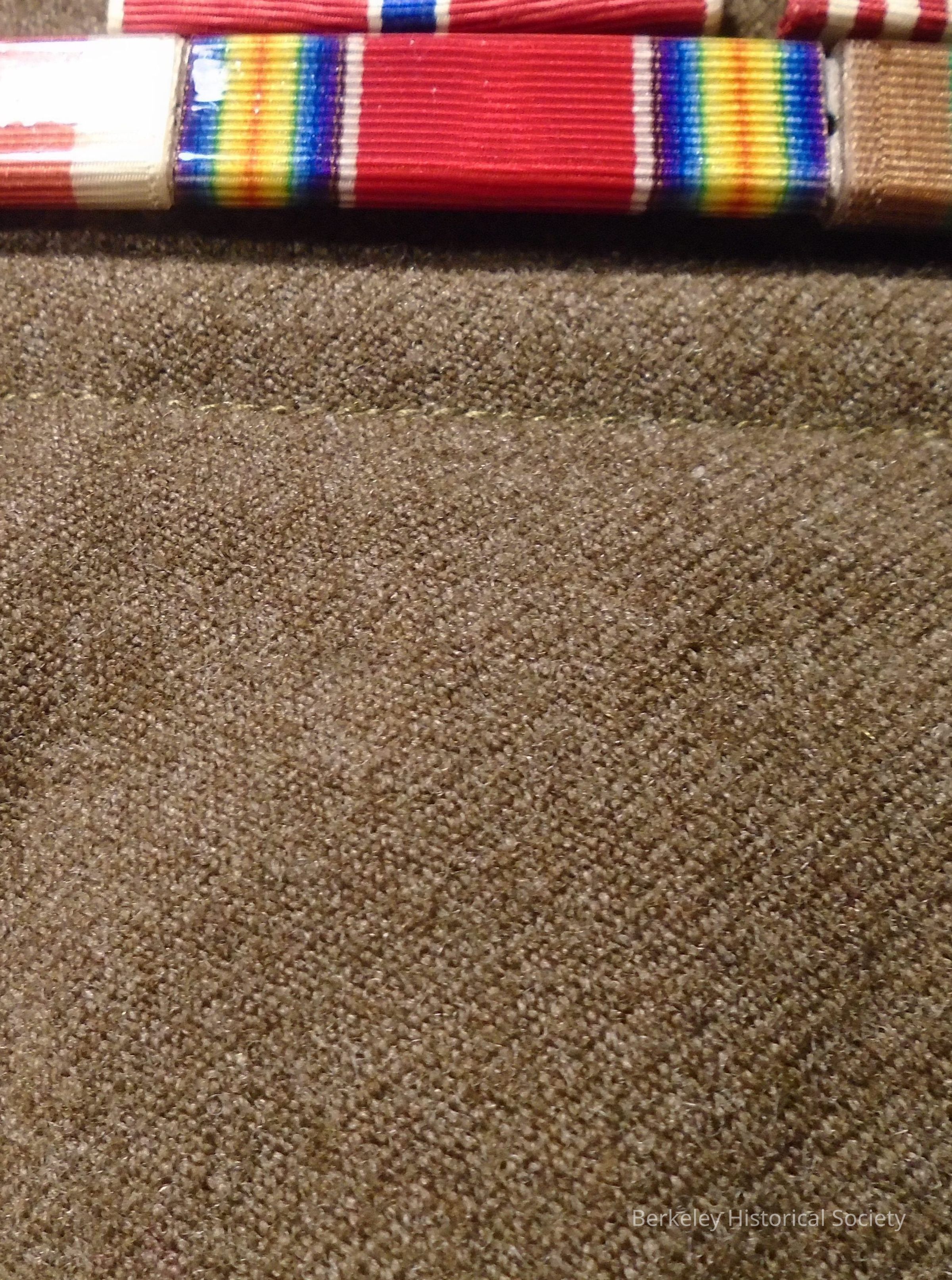 Army Victory Ribbon, red, yellow, blue, purple and covered in plastic. Attached to Occupation Ribbon and European Theatre Ribbon. Tack pin on back. Worn on U.S. Army World War II Ike jacket belonging to William L. Close, Jr. #39048317, Technician Third Grade, 309th Infantry Regiment, Army of the United States. (See 2019.005.1) One of 11 removable pins/medals.Dimensions
