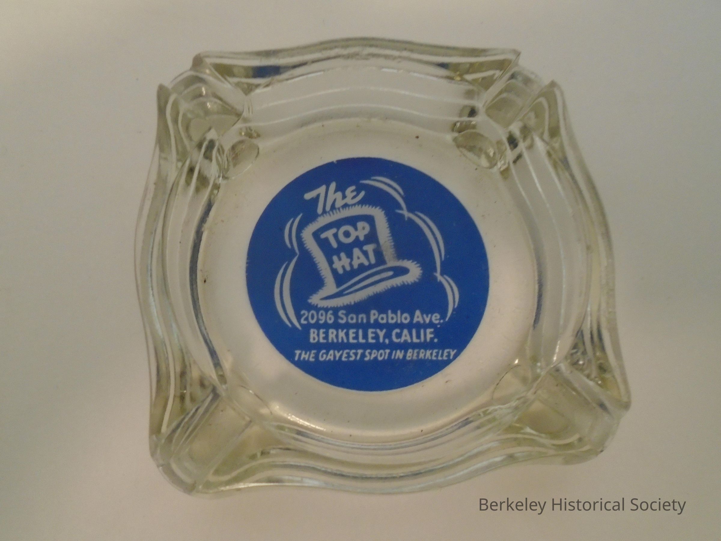 Square, clear glass ashtray. Picture of a top hat in blue and white with "The TOP HAT 2096 San Pablo Ave., Berkeley, Calif. The Gayest spot in Berkeley."