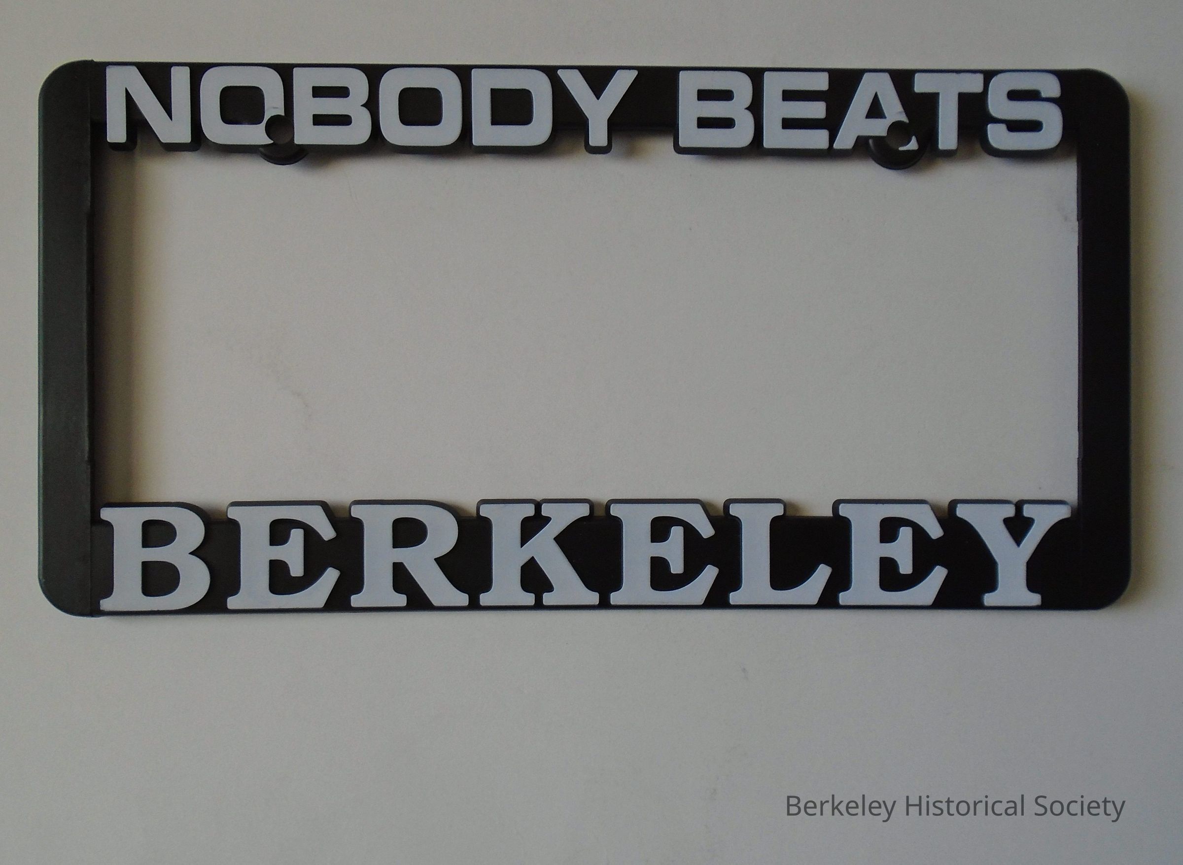 Black plastic auto license plate holder with white lettering "Nobody Beats Berkeley". Handed out by Toyota. See also 2009.049.001 (duplicate).Lexicon