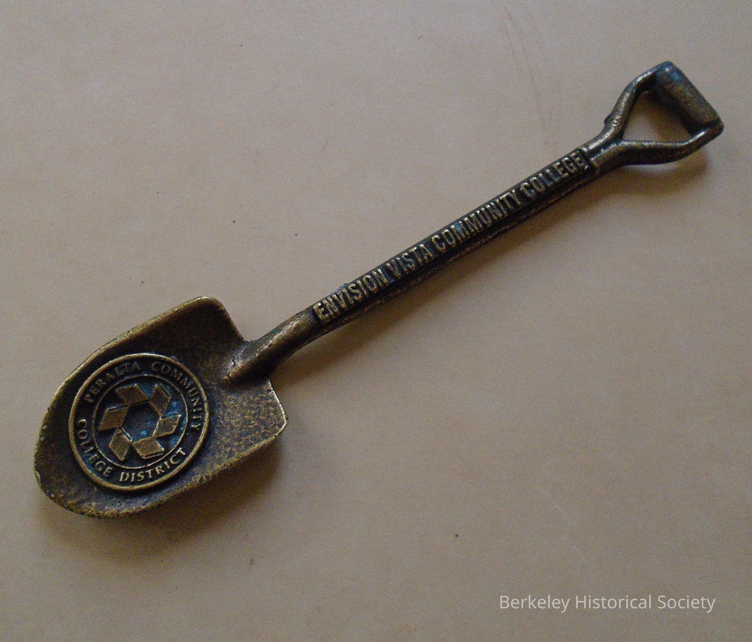 Commemorative, metal miniature shovel. Gold color with text "Envision Vista Community College Peralta Community College District. (There is a second shovel: 2013.400.004)