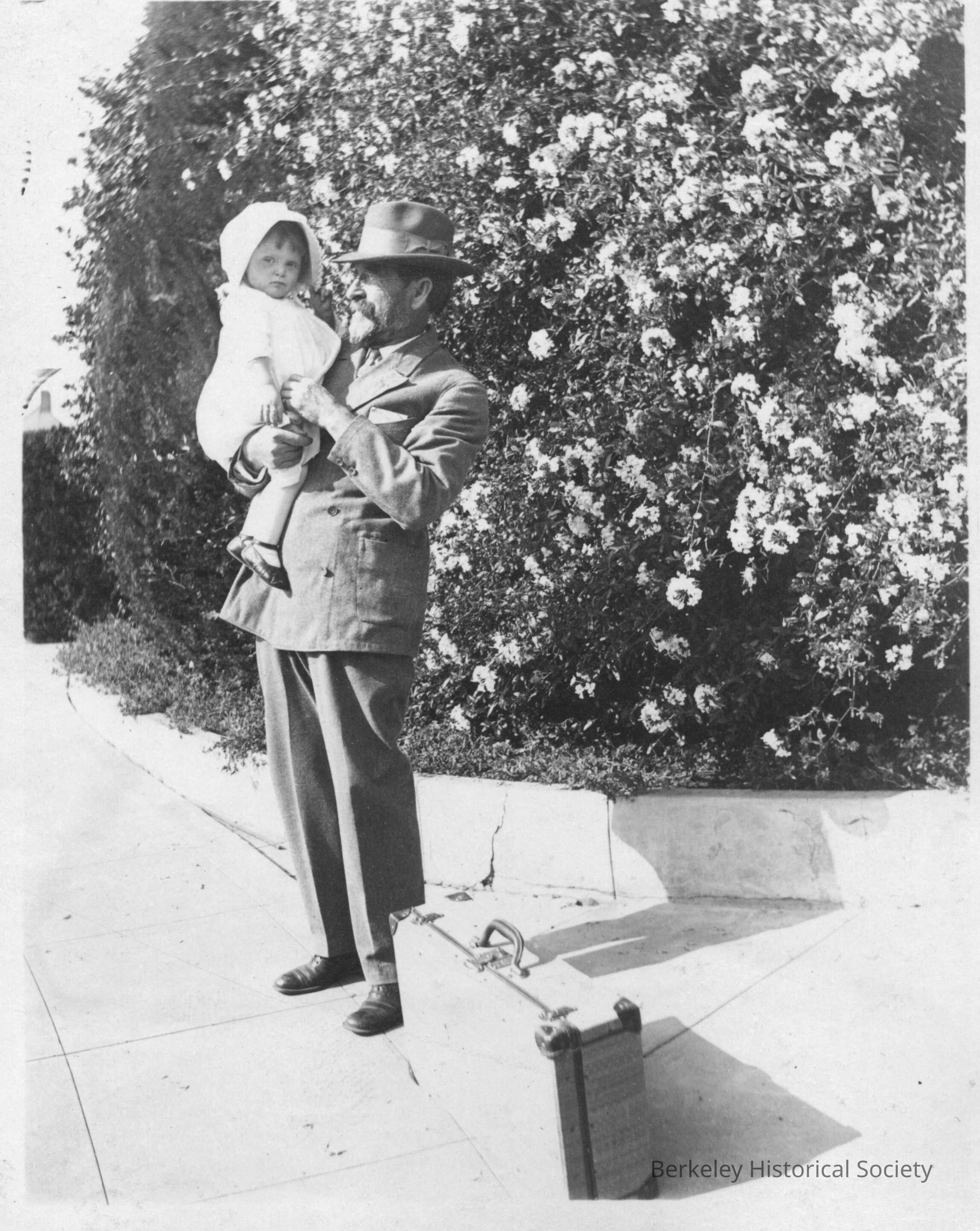B.M. Newcomb stands on the sidewalk, holding his baby granddaughter Dorothy (Pearl's daughter).
