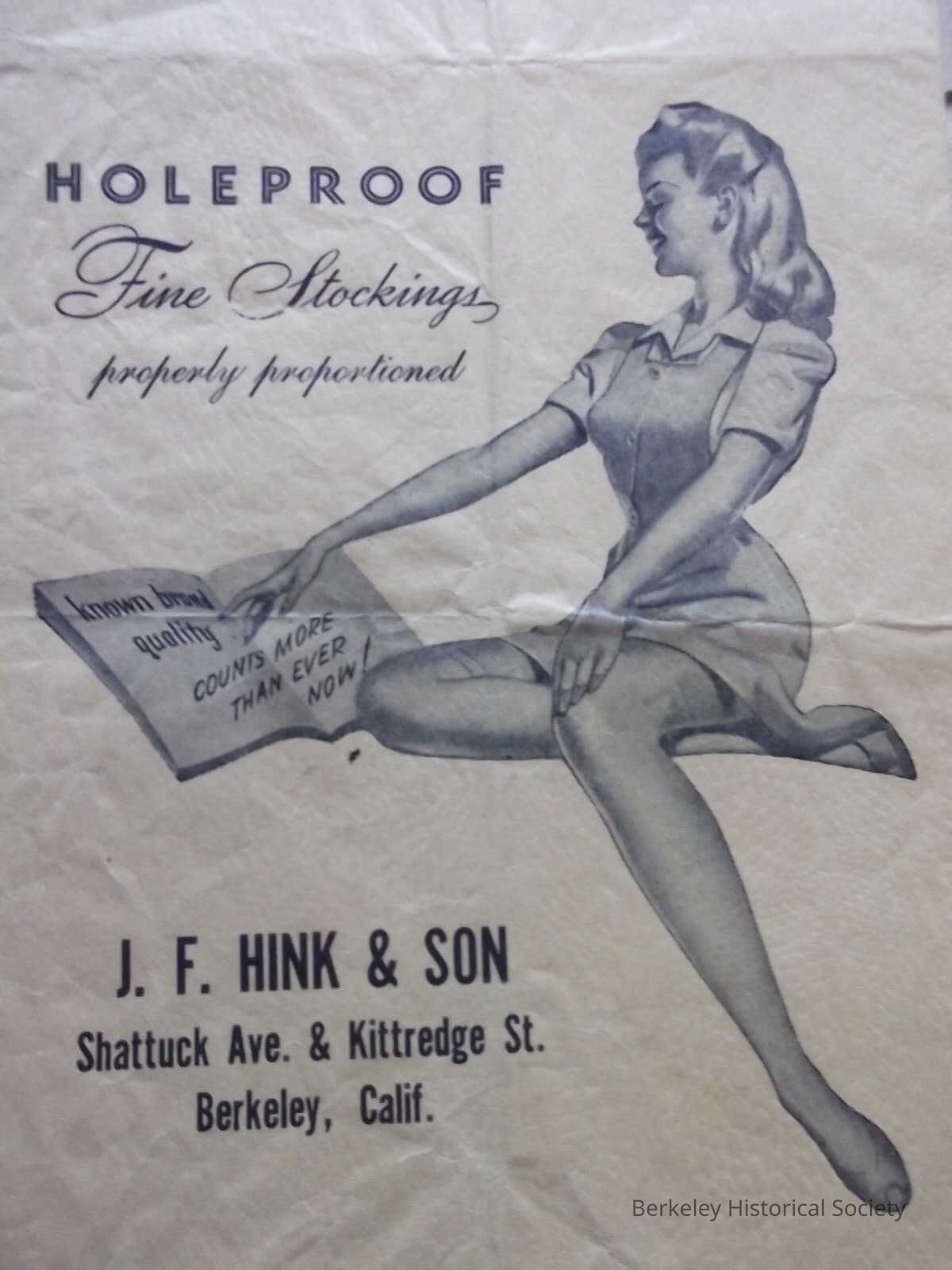 Brown paper envelope for pair of women's stockings. Printed on it: "J.F. Hink & Son, Shattuck Ave. & Kittredge St., Berkeley, Calif." and "Holeproof Fine Stockings properly proportioned" with a picture of a woman.