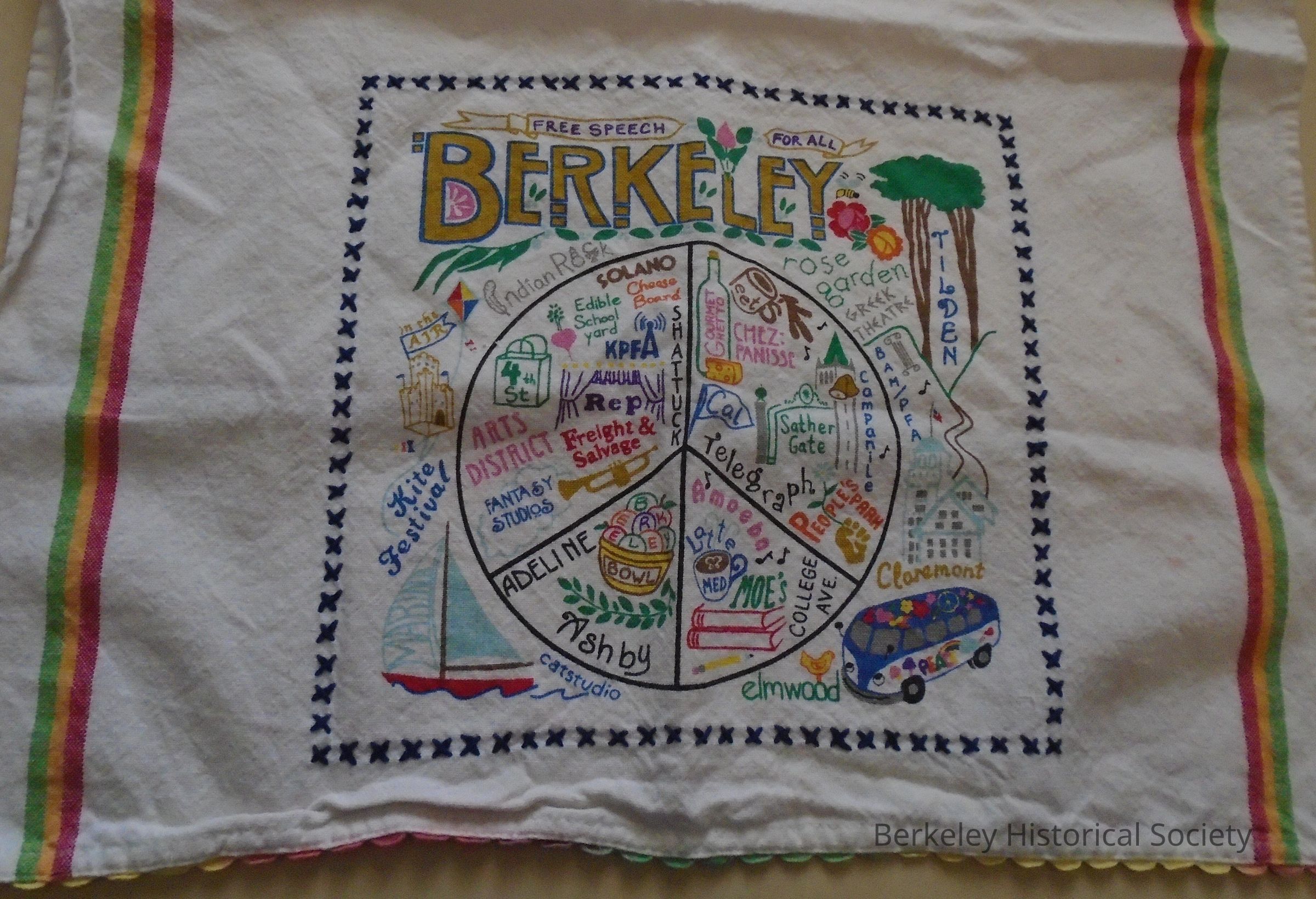 Cotton tea towel with hand embroidery and silk screen of Berkeley sights, street names, events, businesses, etc. enclosed in a peace symbol. Label shows "catstudio 2019".Made/Created