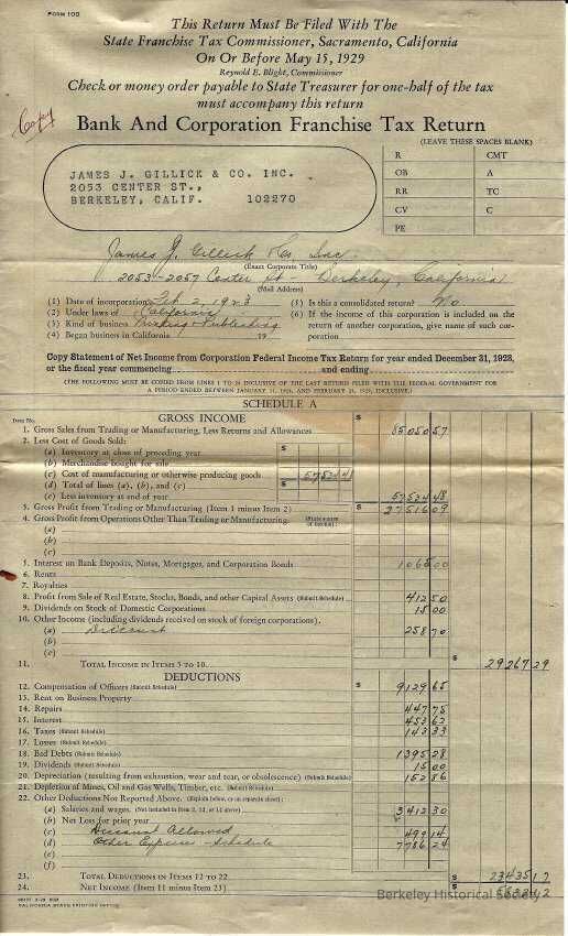 Box includes certificate of articles of incorporation by California Dept of State, 1923; tax forms for 1928 and 1929; Berkeley Gazette, 3/6/1967 with photo of Martin Robertson, vice president; Berkeley Gazette, 10/31/1968 "'68 Progress Report" section, with Gillick advertisement.