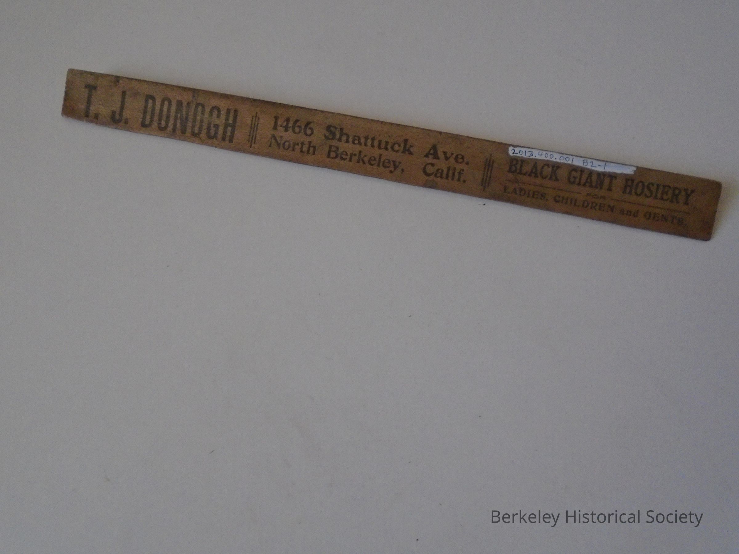 Wood ruler advertising T.J.Donogh, 1466 Shattuck Ave., North Berkeley, Calif. , Dry Goods Notions, Ladies' and Gents' Furnishings.Lexicon