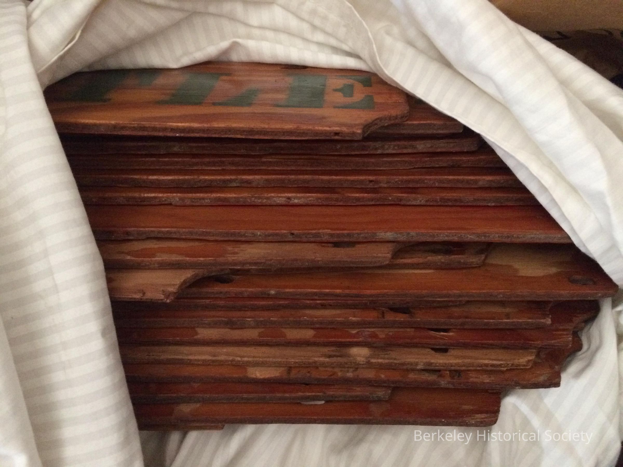 23 wooden ice cream flavor signs: natural colored, varnished plywood in miscellaneous lengths, with stenciled letters in miscellaneous colors. Holes along top for hanging. Used in McCallum's Famous Ice Cream at 1825 Solano Ave. Advertised 40 flavors and a soda bar. In business early 1960's-through 1990.