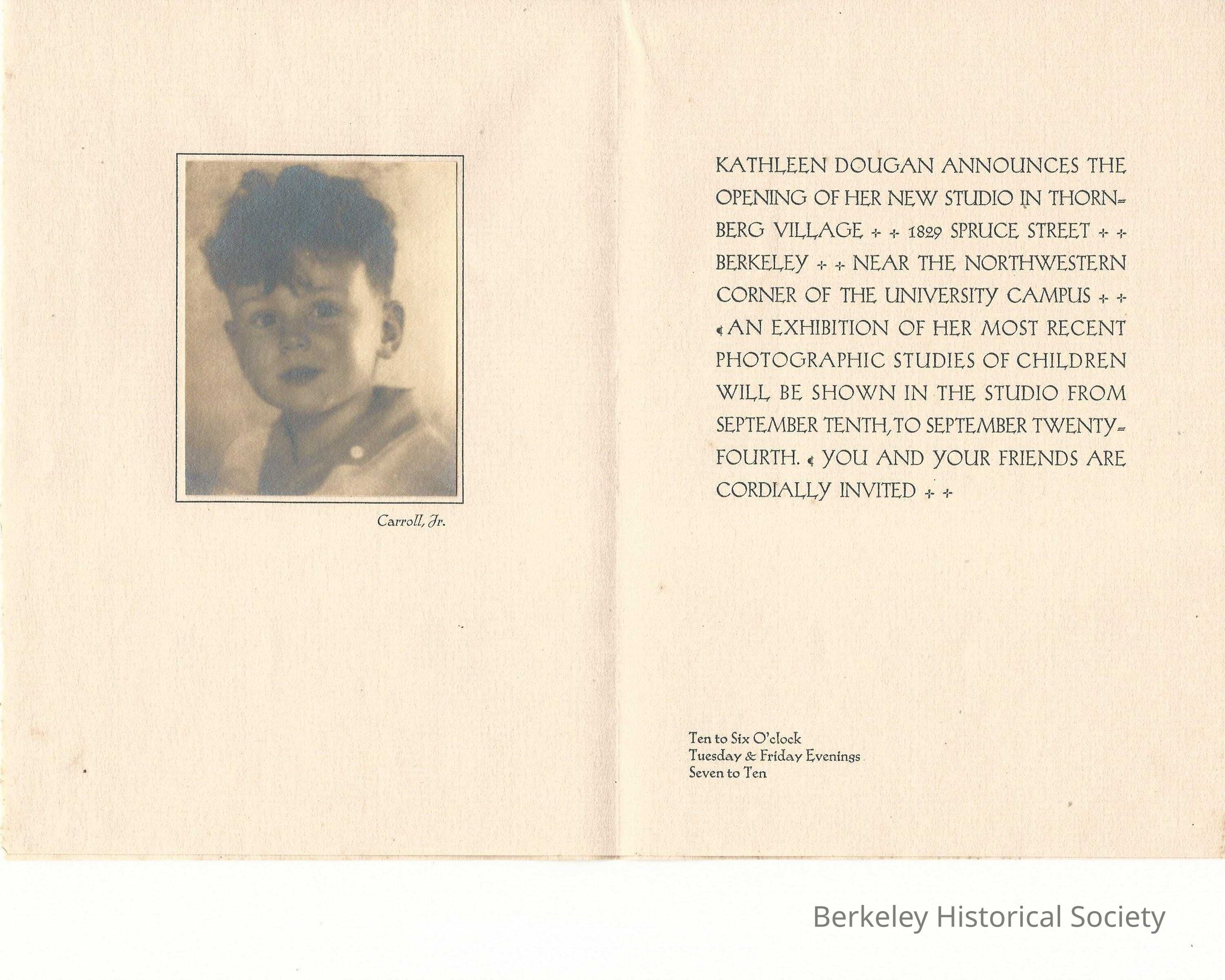 Folded sheet announcing the opening of her photographic studio at 1829 Spruce Street in Thornberg Village, more popularly known now as Normandy Village.