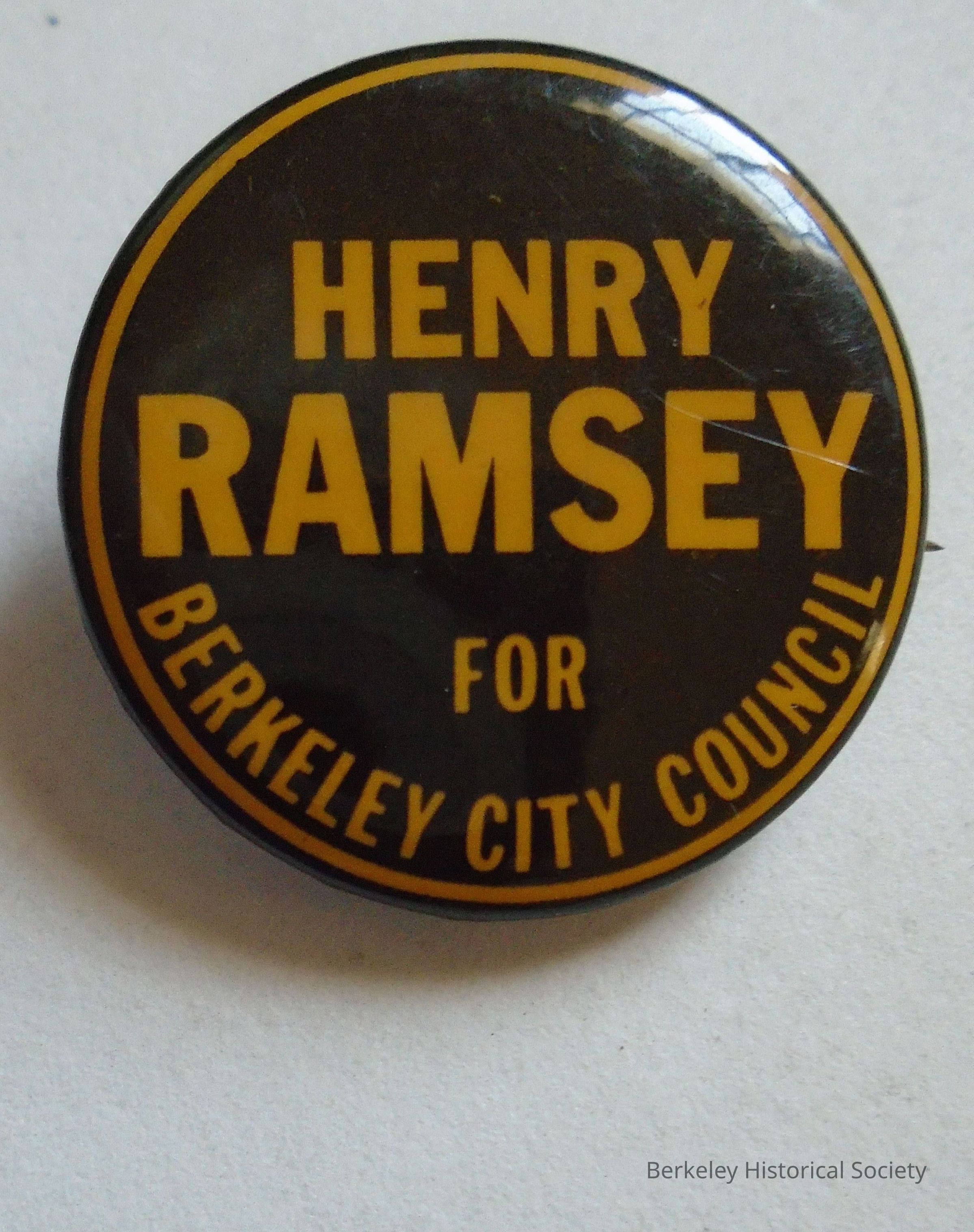 Round, metal and paper campaign button in black and gold: "HENRY RAMSEY for Berkeley City Council". Ramsey served on the City Council 1973-1977. He was on the law faculty Boalt hall (UC Berkeley) 1971-1980, a Superior Court of CA judge 1981-1990, dean of Howard University School of Law 1991-1996 and a civil rights activist and active in diversity issues (he was African American). b: 1934 d: 2014