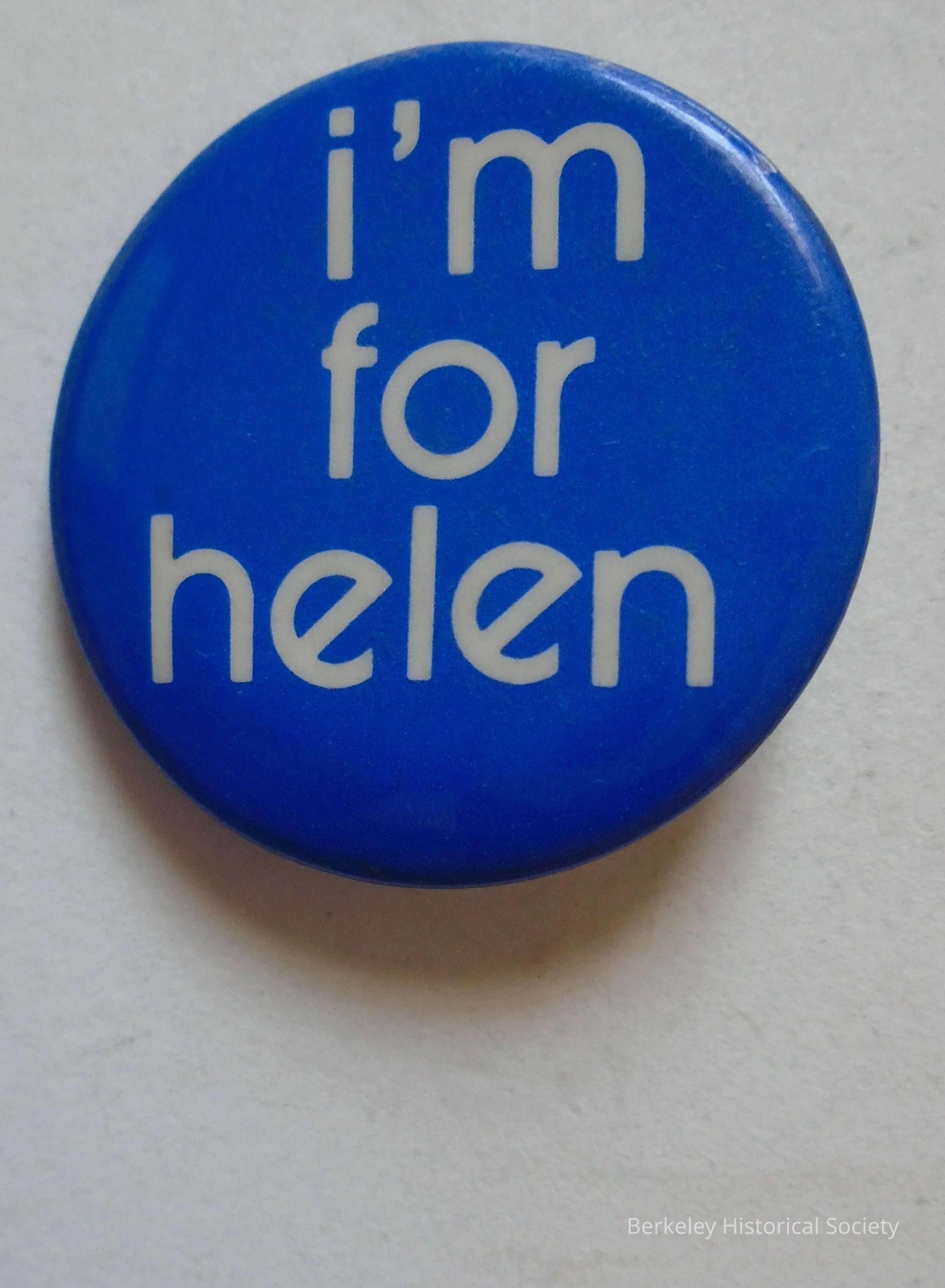 Round metal and paper campaign button, blue with white text: "i'm for helen". No last name or date, but could be Helen Cunningham who was on the City Council 1951-1952?